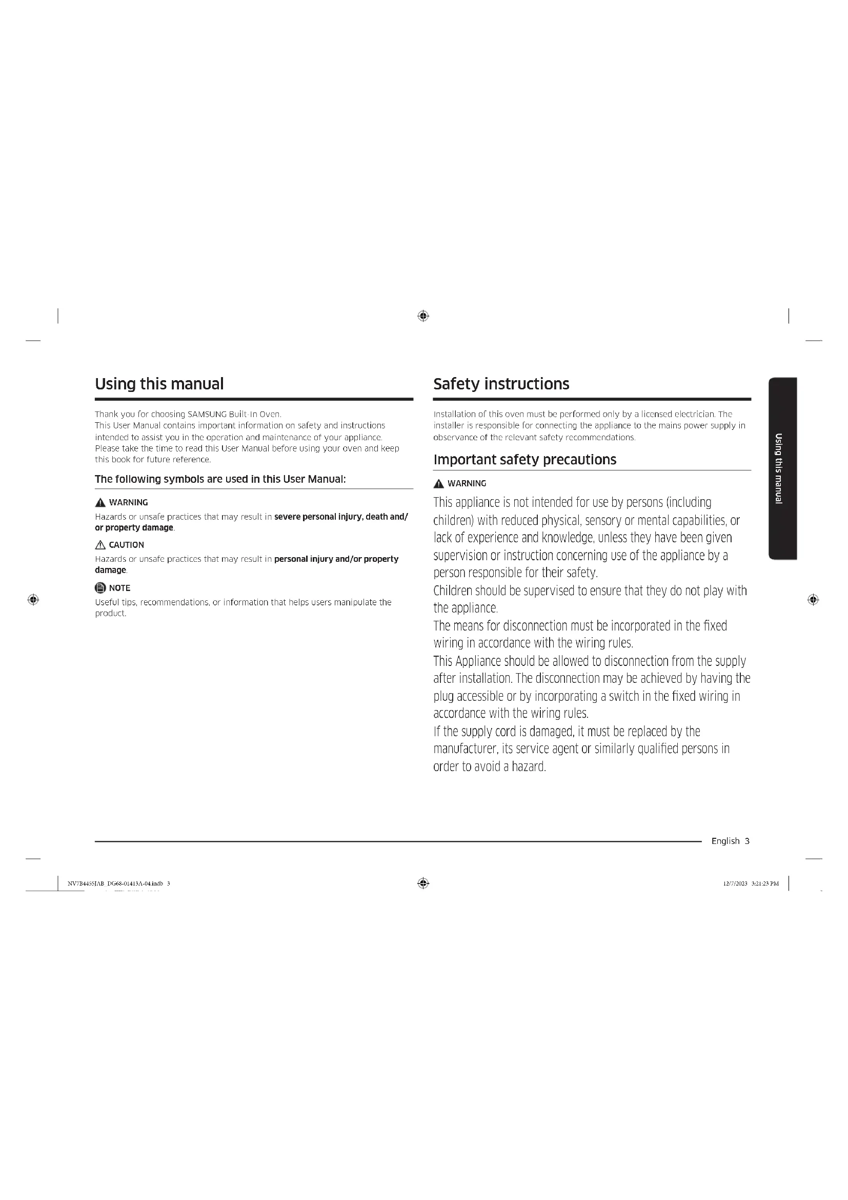 Product data sheet 54 Open Source Announcement 55 NV7B4455JAB_DG68-01413A-04.indb 2NV7B4455JAB_DG68-01413A-04.indb 2 12/7/2023 3:21:22 PM12/7/2023 3:21:22 PMEnglish 3 Using this manual Safety instructions Installation of this oven must be performed only by a licensed electrician. The installer is responsible for connecting the appliance to the mains power supply in observance of the relevant safety recommendations. Important safety precautions WARNING This appliance is not intended for use by persons (including children) with reduced physical, sensory or mental capabilities, or lack of experience and knowledge, unless they have been given supervision or instruction concerning use of the appliance by a person responsible for their safety. Children should be supervised to ensure that they do not play with the appliance. The means for disconnection must be incorporated in the xed wiring in accordance with the wiring rules. This Appliance should be allowed to disconnection from the supply after installation. The disconnection may be achieved by having the plug accessible or by incorporating a switch in the xed wiring in accordance with the wiring rules. If the supply cord is damaged, it must be replaced by the manufacturer, its service agent or similarly qualied persons in order to avoid a hazard. Using this manual Thank you for choosing SAMSUNG Built-In Oven. This User Manual contains important information on safety and instructions intended to assist you in the operation and maintenance of your appliance. Please take the time to read this User Manual before using your oven and keep this book for future reference. The following symbols are used in this User Manual: WARNING Hazards or unsafe practices that may result in severe personal injury, death and/ or property damage. CAUTION Hazards or unsafe practices that may result in personal injury and/or property damage. NOTE Useful tips, recommendations, or information that helps users manipulate the product. NV7B4455JAB_DG68-01413A-04.indb 3NV7B4455JAB_DG68-01413A-04.indb 3 12/7/2023 3:21:23 PM12/7/2023 3:21:23 PM4 English Safety instructions Safety instructions The method of xing stated is not to depend on the use of adhesives since they are not considered to be a reliable xing means. This appliance can be used by children aged from 8 years and above and persons with reduced physical, sensory or mental capabilities or lack of experience and knowledge if they have been given supervision or instruction concerning use of the appliance in a safe way and understand the hazards involved. Children shall not play with the appliance. Cleaning and user maintenance shall not be made by children without supervision. Keep the appliance and its cord out of reach of children less than 8 years. During use the appliance becomes hot. Care should be taken to avoid touching heating elements inside the oven.