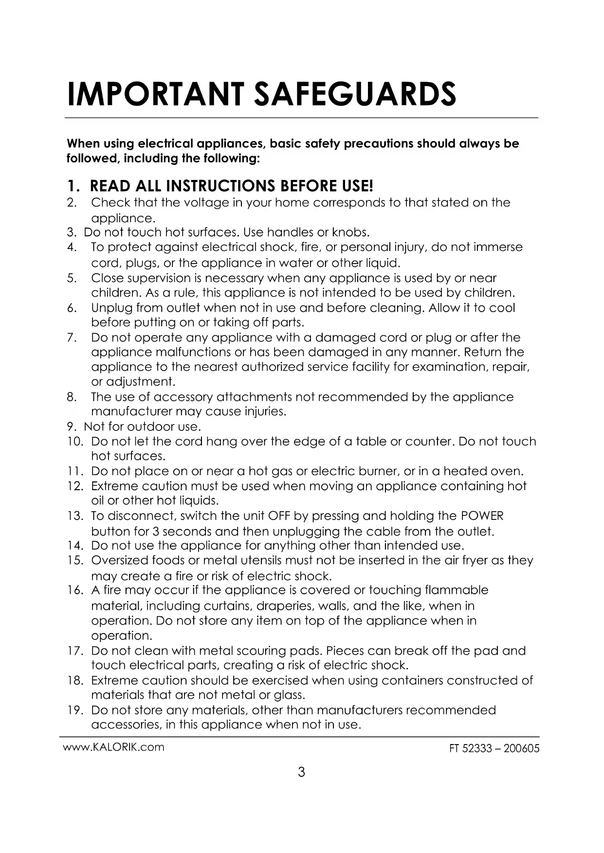 www.KALORIK.com IMPORTANT SAFEGUARDS When using electrical appliances, basic safety precautions should always be followed, including the following: