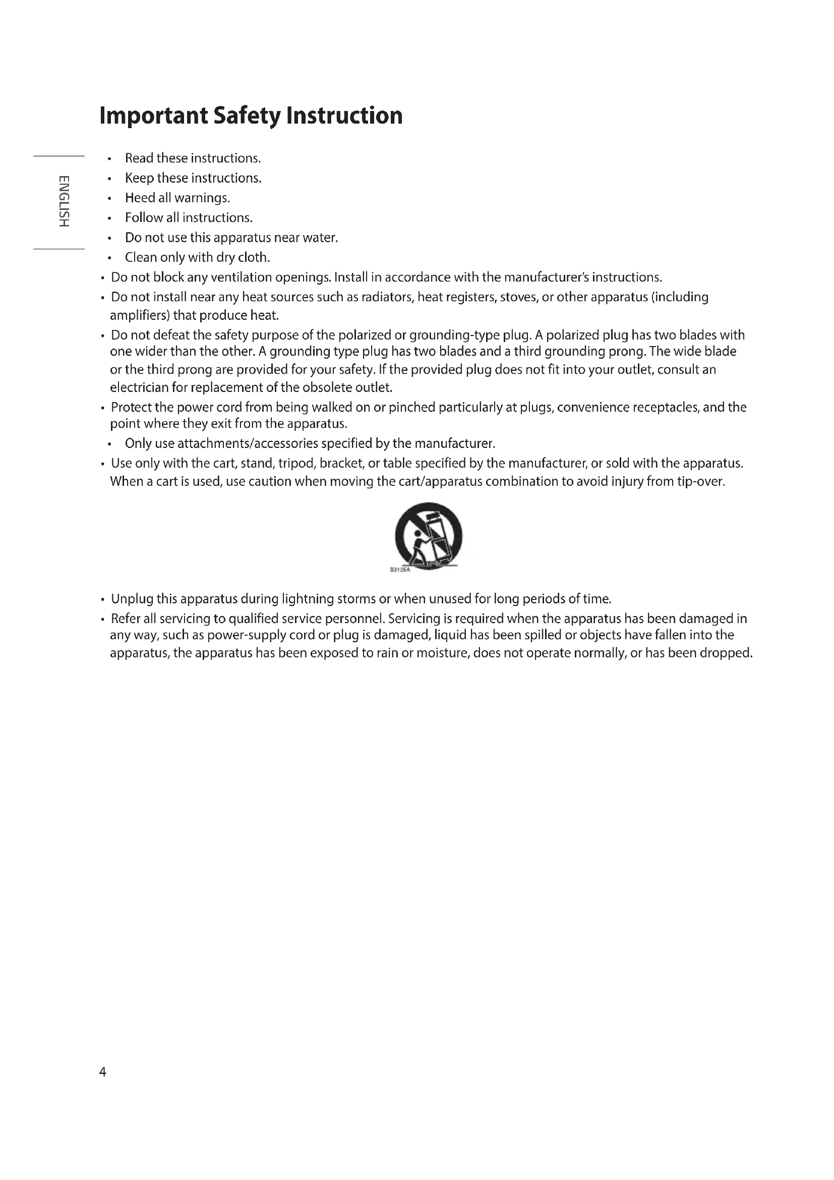 - Use only with the cart, stand, tripod, bracket, or table specified by the manufacturer, or sold with the apparatus. When a cart is used, use caution when moving the cart/apparatus combination to avoid injury from tip-over.