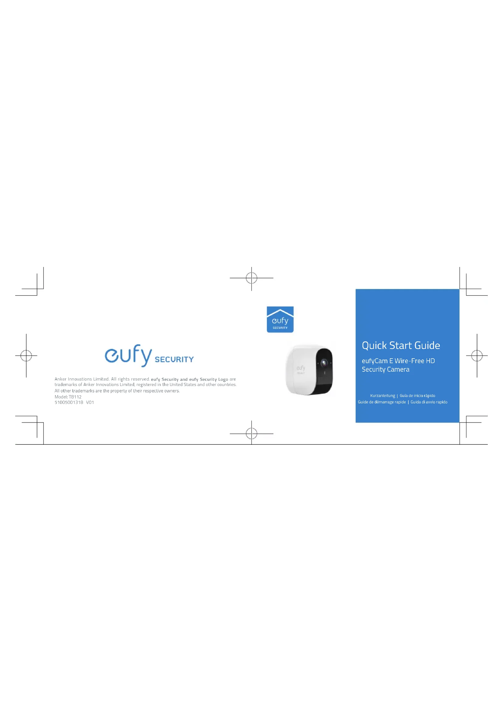 Quick Start Guide eufyCam E Wire-Free HD Security Camera Anker Innovations Limited. All rights reserved. eufy Security and eufy Security Logo are trademarks of Anker Innovations Limited, registered in the United States and other countries. All other trademarks are the property of their respective owners. Model: T8112 51005001318 V01 Kurzanleitung | Guía de inicio rápido Guide de démarrage rapide | Guida di avvio rapidoEnglish