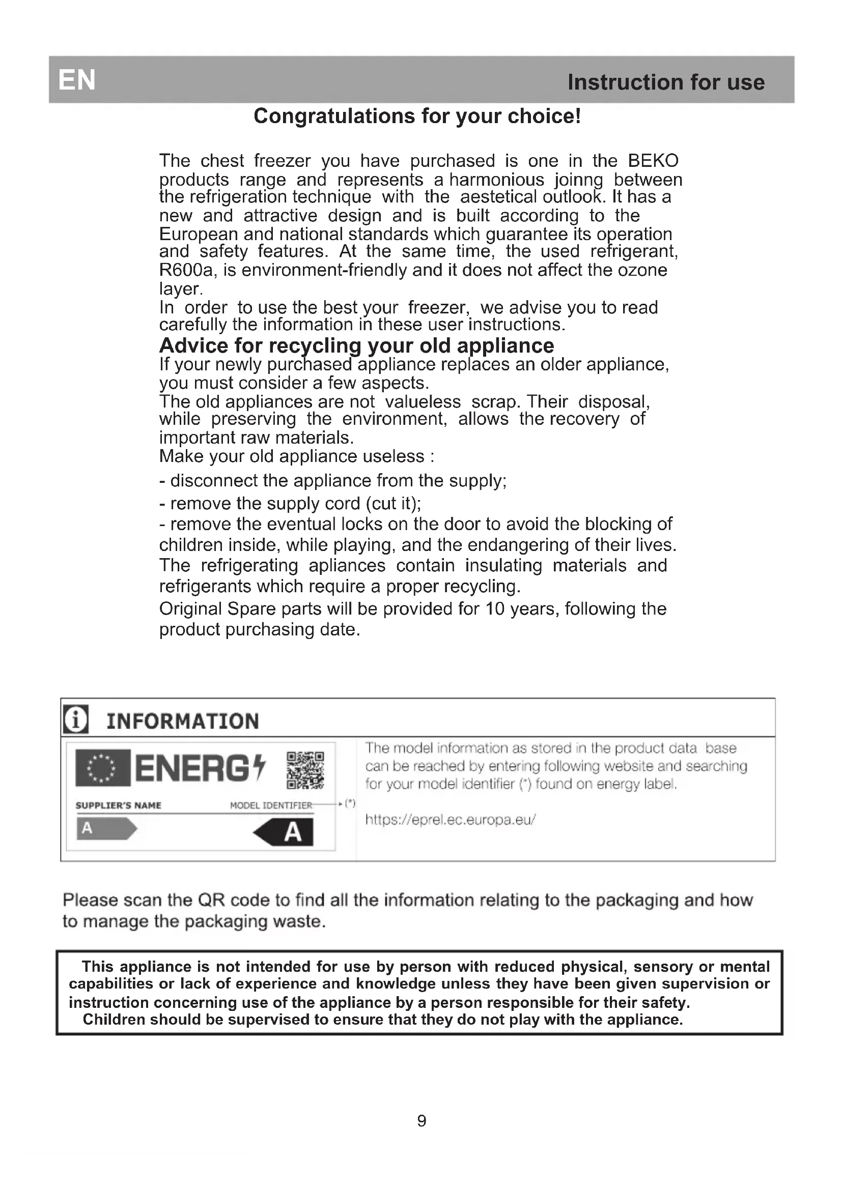 4Congratulations for your choice! The chest freezer you have purchased is one in the BEKO products range and represents a harmonious joinng between the refrigeration technique with the aestetical outlook. It has a new and attractive design and is built according to the European and national standards which guarantee its operation and safety features. At the same time, the used refrigerant, R600a, is environment-friendly and it does not affect the ozone layer. In order to use the best your freezer, we advise you to read carefully the information in these user instructions. Advice for recycling your old appliance If your newly purchased appliance replaces an older appliance, you must consider a few aspects. The old appliances are not valueless scrap. Their disposal, while preserving the environment, allows the recovery of important raw materials. Make your old appliance useless : - disconnect the appliance from the supply; - remove the supply cord (cut it); - remove the eventual locks on the door to avoid the blocking of children inside, while playing, and the endangering of their lives. The refrigerating apliances contain insulating materials and refrigerants which require a proper recycling. Original Spare parts will be provided for 10 years, following the product purchasing date.