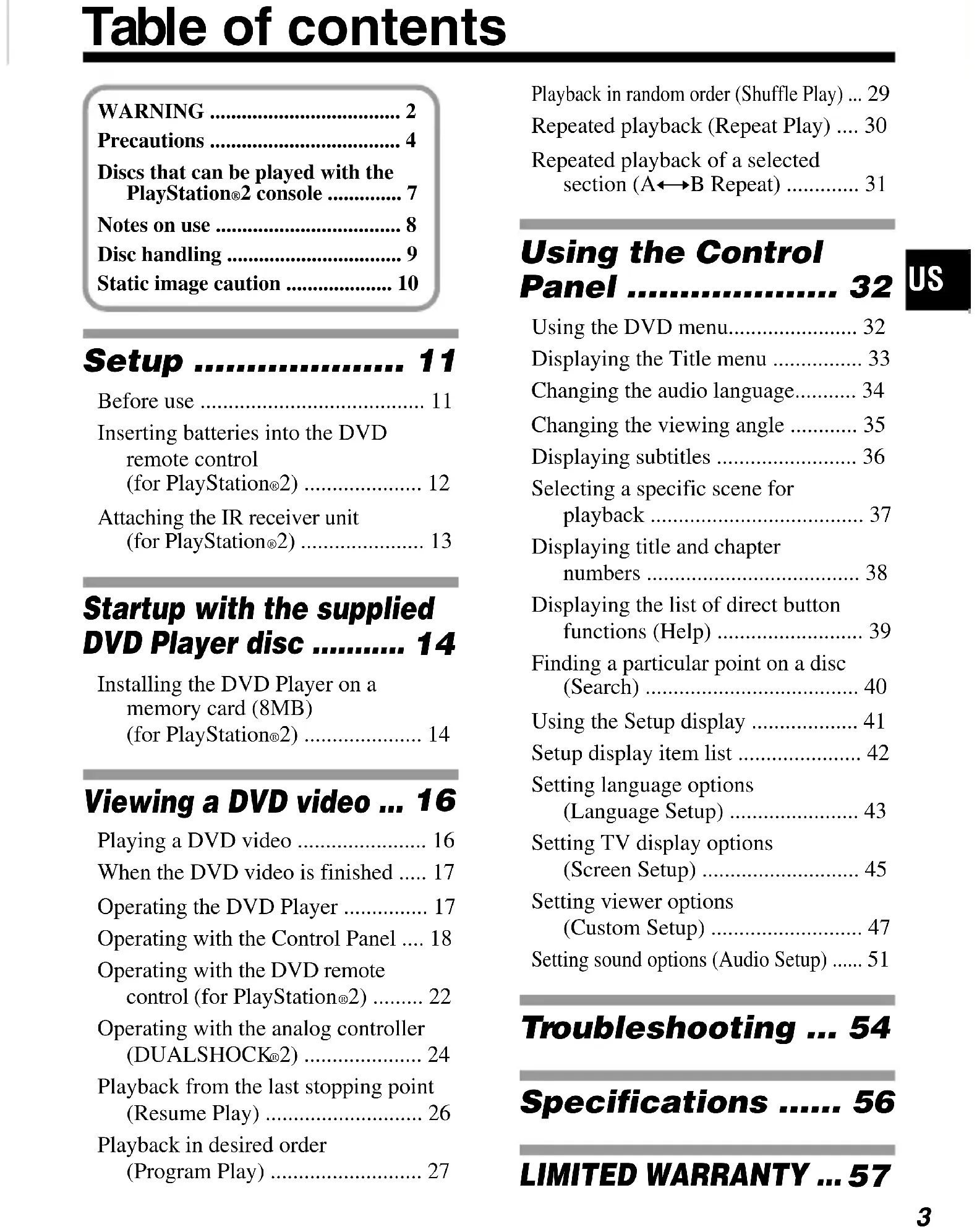 Picture quality When you play a DVD video, picture noise appears. , The settings are not correct. When using the component AV cable (for PlayStation®2), you must set the “Component Video Out” option of the console System Configuration menu to “Y Cb/Pb Cr/Pr.” For details, refer to the PlayStation®2 console instruction manual. DVD video operation Disc playback does not start from the beginning of the DVD. , Program Play, Shuffle Play, Repeat Play or AyB Repeat is set. Refer to the instructions on pages 27-31 of this manual for the method of clearing each of these special playback modes.56 Specifications