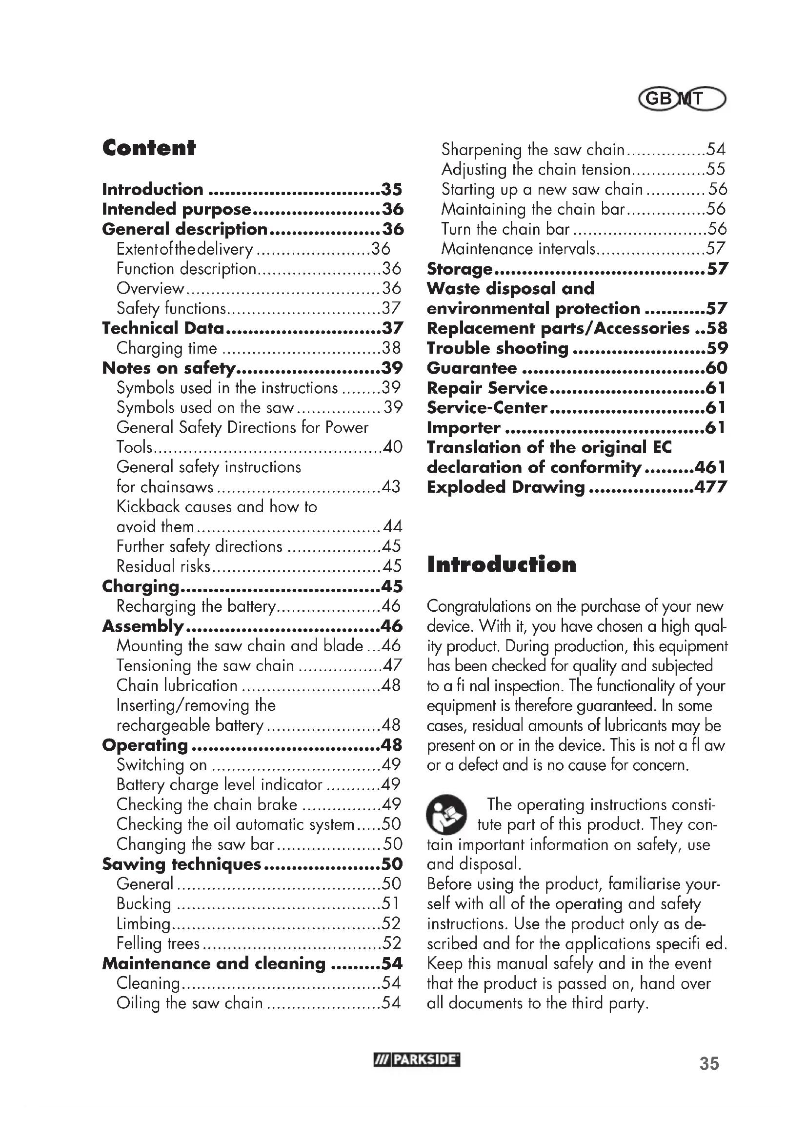 - Exploded Drawing Introduction Congratulations on the purchase of your new device. With it, you have chosen a high qual- ity product. During production, this equipment has been checked for quality and subjected to a fi nal inspection. The functionality of your equipment is therefore guaranteed. In some cases, residual amounts of lubricants may be present on or in the device. This is not a fl aw or a defect and is no cause for concern. The operating instructions consti- tute part of this product. They con- tain important information on safety, use and disposal. Before using the product, familiarise your- self with all of the operating and safety instructions. Use the product only as de- scribed and for the applications specifi ed. Keep this manual safely and in the event that the product is passed on, hand over all documents to the third party.36 GB MT Intended purpose The cordless chainsaw is constructed for sawing wood only. The saw is not de- signed for any other types of application (e.g. cutting of brickwork, plastic or food). The device is part of the ( Parkside) X20VTEAM series and can be oper- ated using ( Parkside) X20VTEAM se- ries batteries. The batteries may only be charged using chargers from the ( Parkside) X20VTEAM series. The chainsaw is designed for employment in the do-it-yourselfer sector. It was not designed for continuous employment in the commercial sector. The device is designed for use by adults. Young people over 16 years old may use the chainsaw under supervision only. The manufacturer is not liable for dam- ages, which were caused through use in applications for which it was not designed, or incorrect operation. This equipment is not suitable for commercial use. Commer- cial use will invalidate the guarantee. This electric chainsaw is to be used only by one person and only for sawing wood. The chainsaw must be held with the right hand on the rear handle and the left hand on the front handle. Before use, the user must have read and understood all of the information and directions in the operating instructions. The user must wear appropri- ate personal protective equipment (PPE). The chainsaw is to be used only for sawing wood. Materials such as plastic, stone, metal or wood containing foreign objects (e.g. nails or screws) must not be cut with the chain saw! General description An illustration of the most im- portant functional components can be found on the fold-out pages. Extent of the delivery Carefully unpack the appliance and check that it is complete: p. 477