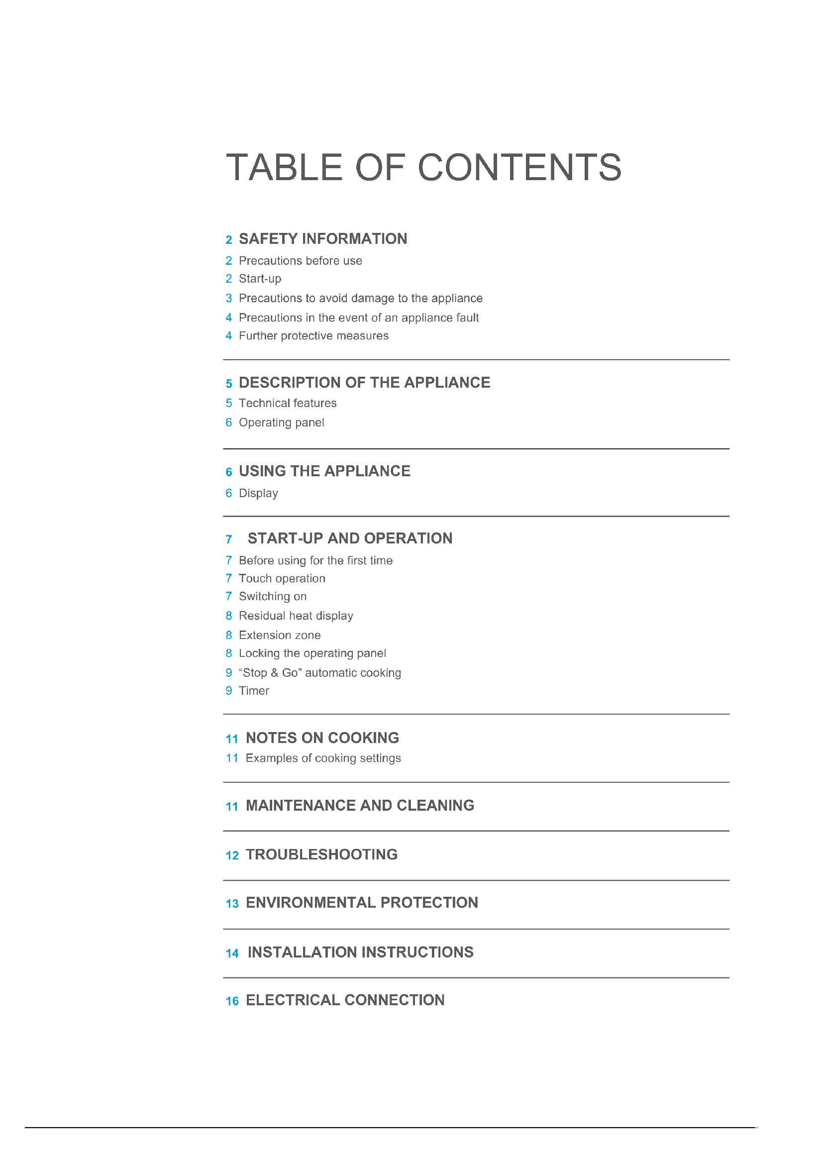 7 Before using for the first time 7 Touch operation 7 Switching on 8 Residual heat display 8 Extension zone 8 Locking the operating panel 9 “Stop & Go” automatic cooking 9 Timer