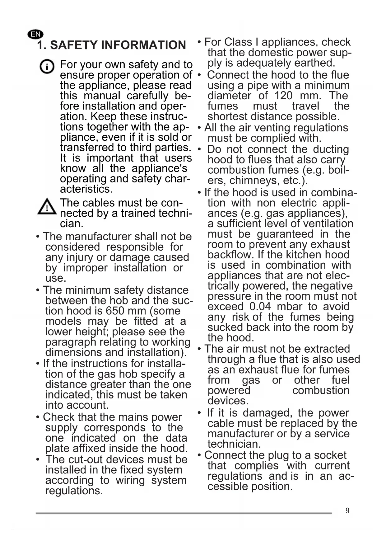 For your own safety and to ensure proper operation of the appliance, please read this manual carefully be- fore installation and oper- ation. Keep these instruc- tions together with the ap- pliance, even if it is sold or transferred to third parties. It is important that users know all the appliance's operating and safety char- acteristics. The cables must be con- nected by a trained techni- cian.