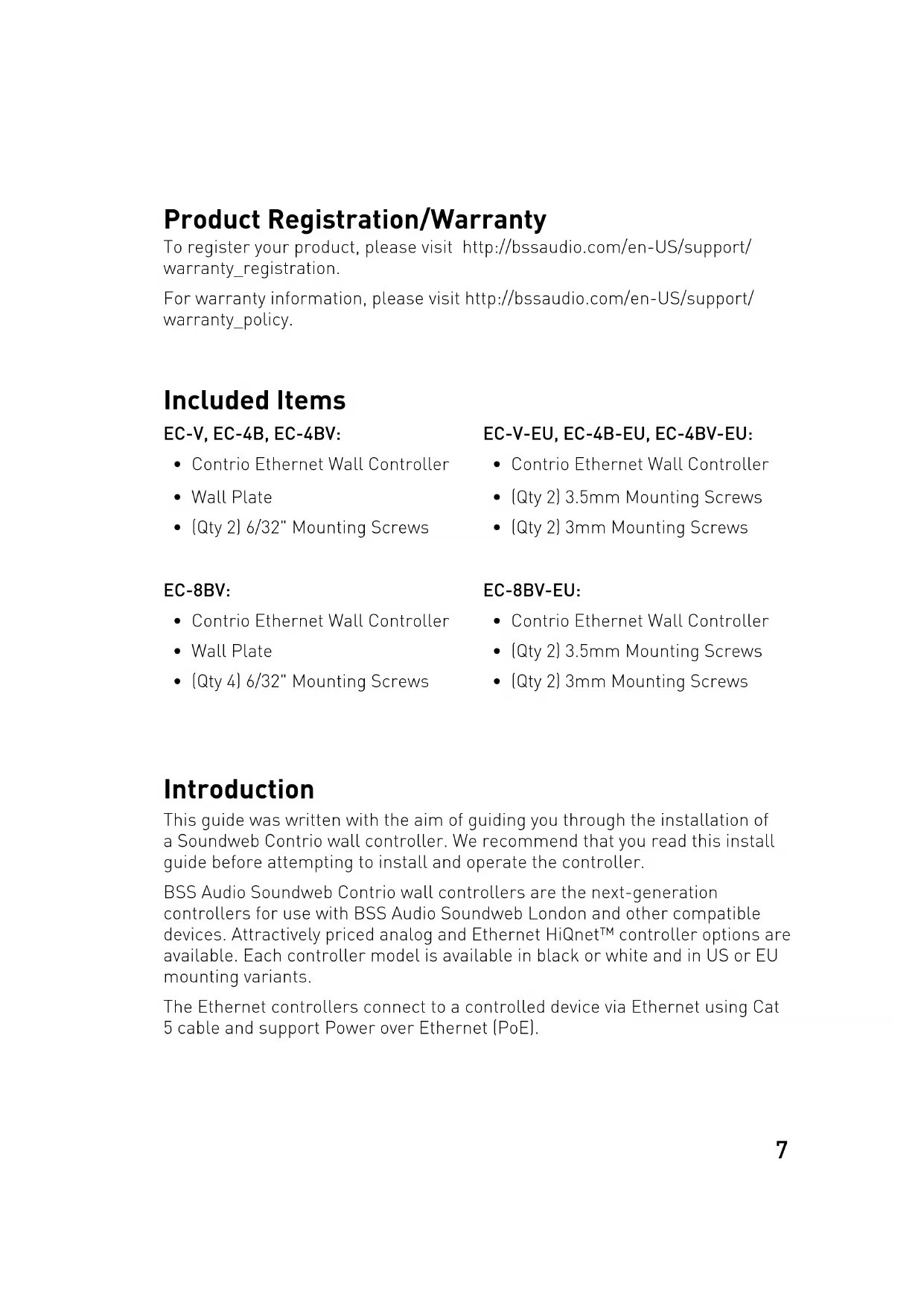 - (Qty 2) 3mm Mounting Screws Introduction This guide was written with the aim of guiding you through the installation of a Soundweb Contrio wall controller. We recommend that you read this install guide before attempting to install and operate the controller. BSS Audio Soundweb Contrio wall controllers are the next-generation controllers for use with BSS Audio Soundweb London and other compatible devices. Attractively priced analog and Ethernet HiQnet™ controller options are available. Each controller model is available in black or white and in US or EU mounting variants. The Ethernet controllers connect to a controlled device via Ethernet using Cat 5 cable and support Power over Ethernet (PoE).8 Ethernet Cable Recommendations When installing Ethernet Contrio controllers, Cat 5, Cat 5e or Cat 6 cabling should be used. Extra care must be taken when using shielded Ethernet cables to ensure the shield does not short to the controller's printed circuit board. Note that bulky molded Ethernet cables may be obstructed by the printed circuit board. Therefore, it is recommended that Ethernet cables with crimp-on type RJ45 connectors be used. Front Panel