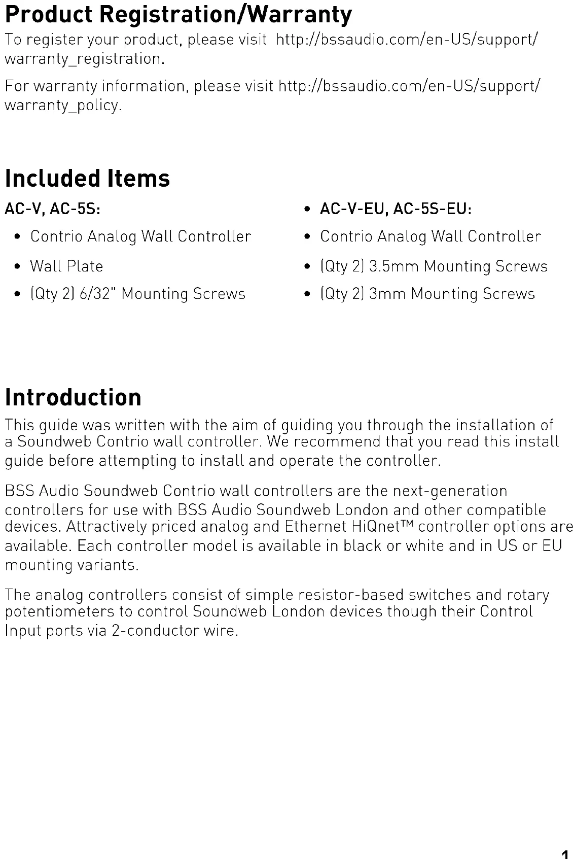 - (Qty 2) 3mm Mounting Screws Introduction This guide was written with the aim of guiding you through the installation of a Soundweb Contrio wall controller. We recommend that you read this install guide before attempting to install and operate the controller. BSS Audio Soundweb Contrio wall controllers are the next-generation controllers for use with BSS Audio Soundweb London and other compatible devices. Attractively priced analog and Ethernet HiQnet™ controller options are available. Each controller model is available in black or white and in US or EU mounting variants. The analog controllers consist of simple resistor-based switches and rotary potentiometers to control Soundweb London devices though their Control Input ports via 2-conductor wire.2 Front Panel