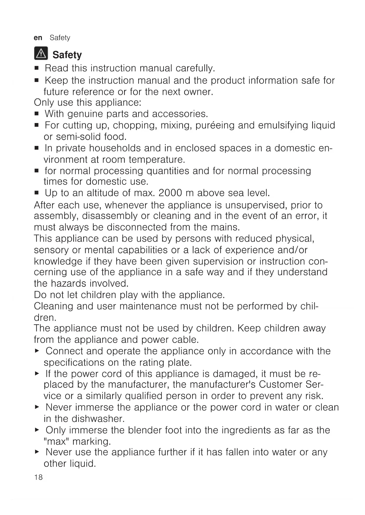 Safety ¡ Read this instruction manual carefully. ¡ Keep the instruction manual and the product information safe for future reference or for the next owner. Only use this appliance: ¡ With genuine parts and accessories. ¡ For cutting up, chopping, mixing, puréeing and emulsifying liquid or semi-solid food. ¡ In private households and in enclosed spaces in a domestic en- vironment at room temperature. ¡ for normal processing quantities and for normal processing times for domestic use. ¡ Up to an altitude of max. 2000m above sea level. After each use, whenever the appliance is unsupervised, prior to assembly, disassembly or cleaning and in the event of an error, it must always be disconnected from the mains. This appliance can be used by persons with reduced physical, sensory or mental capabilities or a lack of experience and/or knowledge if they have been given supervision or instruction con- cerning use of the appliance in a safe way and if they understand the hazards involved. Do not let children play with the appliance. Cleaning and user maintenance must not be performed by chil- dren. The appliance must not be used by children. Keep children away from the appliance and power cable. ▶ Connect and operate the appliance only in accordance with the specifications on the rating plate. ▶ If the power cord of this appliance is damaged, it must be re- placed by the manufacturer, the manufacturer's Customer Ser- vice or a similarly qualified person in order to prevent any risk. ▶ Never immerse the appliance or the power cord in water or clean in the dishwasher. ▶ Only immerse the blender foot into the ingredients as far as the "max" marking. ▶ Never use the appliance further if it has fallen into water or any other liquid.Avoiding material damage en