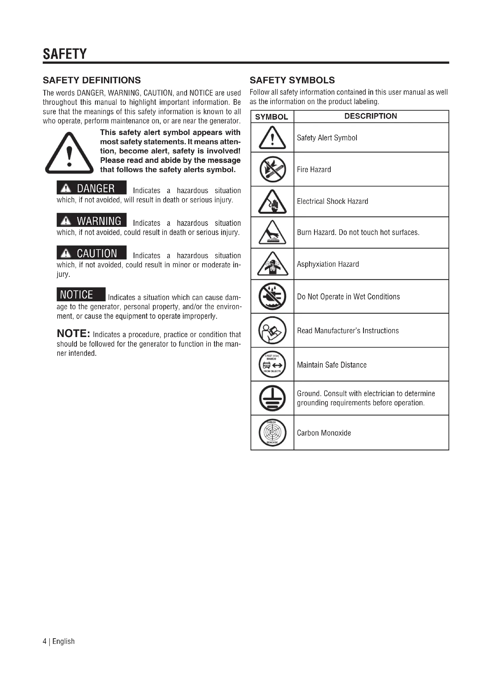Carbon Monoxide SAFETY DEFINITIONS The words DANGER, WARNING, CAUTION, and NOTICE are used throughout this manual to highlight important information. Be sure that the meanings of this safety information is known to all who operate, perform maintenance on, or are near the generator. This safety alert symbol appears with most safety statements. It means atten- tion, become alert, safety is involved! Please read and abide by the message that follows the safety alerts symbol. DANGER Indicates a hazardous situation which, if not avoided, will result in death or serious injury. WARNING Indicates a hazardous situation which, if not avoided, could result in death or serious injury. CAUTION Indicates a hazardous situation which, if not avoided, could result in minor or moderate in- jury. NOTICE Indicates a situation which can cause dam- age to the generator, personal property, and/or the environ- ment, or cause the equipment to operate improperly. NOTE: Indicates a procedure, practice or condition that should be followed for the generator to function in the man- ner intended.English | 5 SAFETY