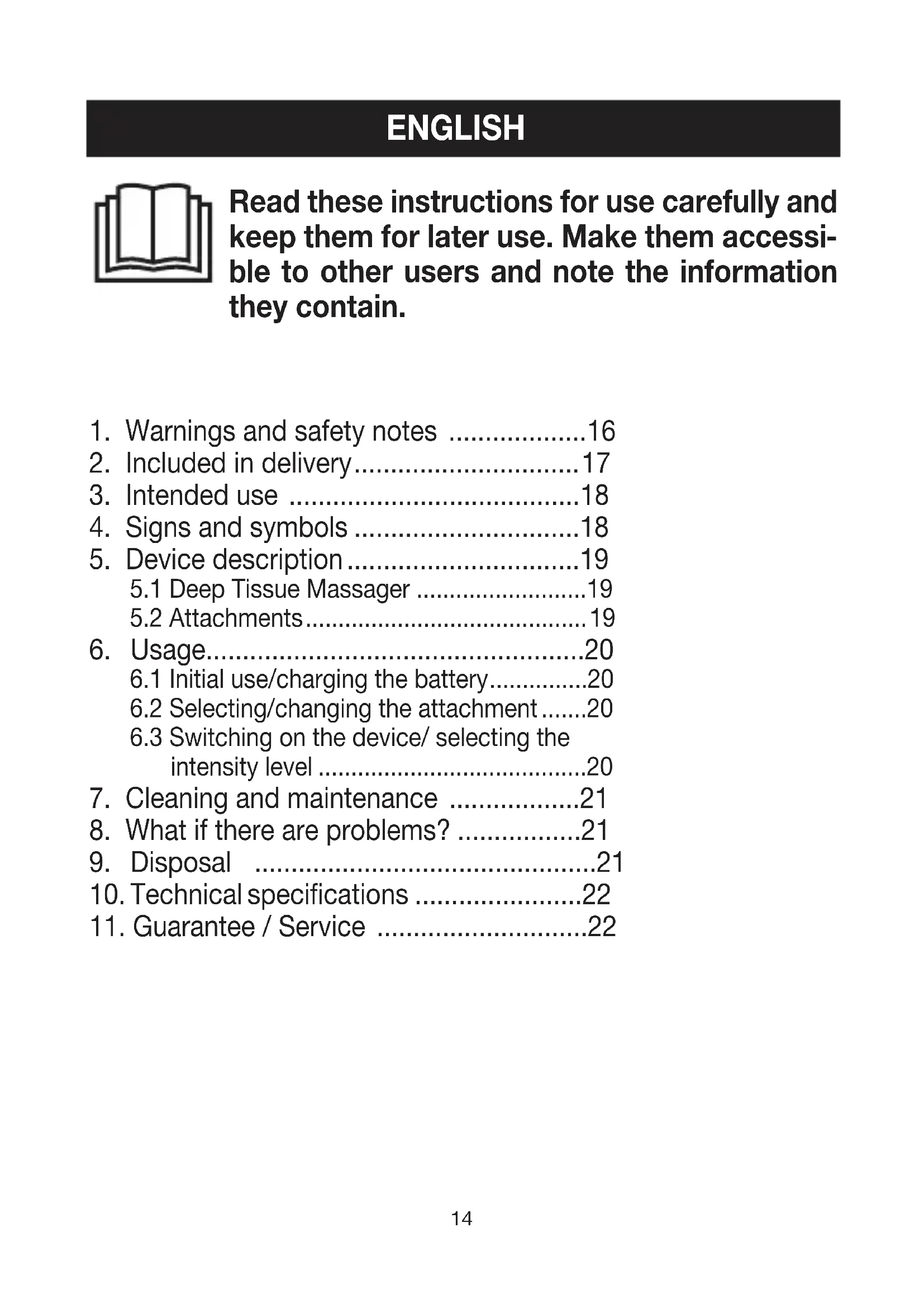 Check that the exterior of the cardboard de- livery packaging is intact and make sure that all contents are present. Before use, ensure that the Deep Tissue Massager and the at