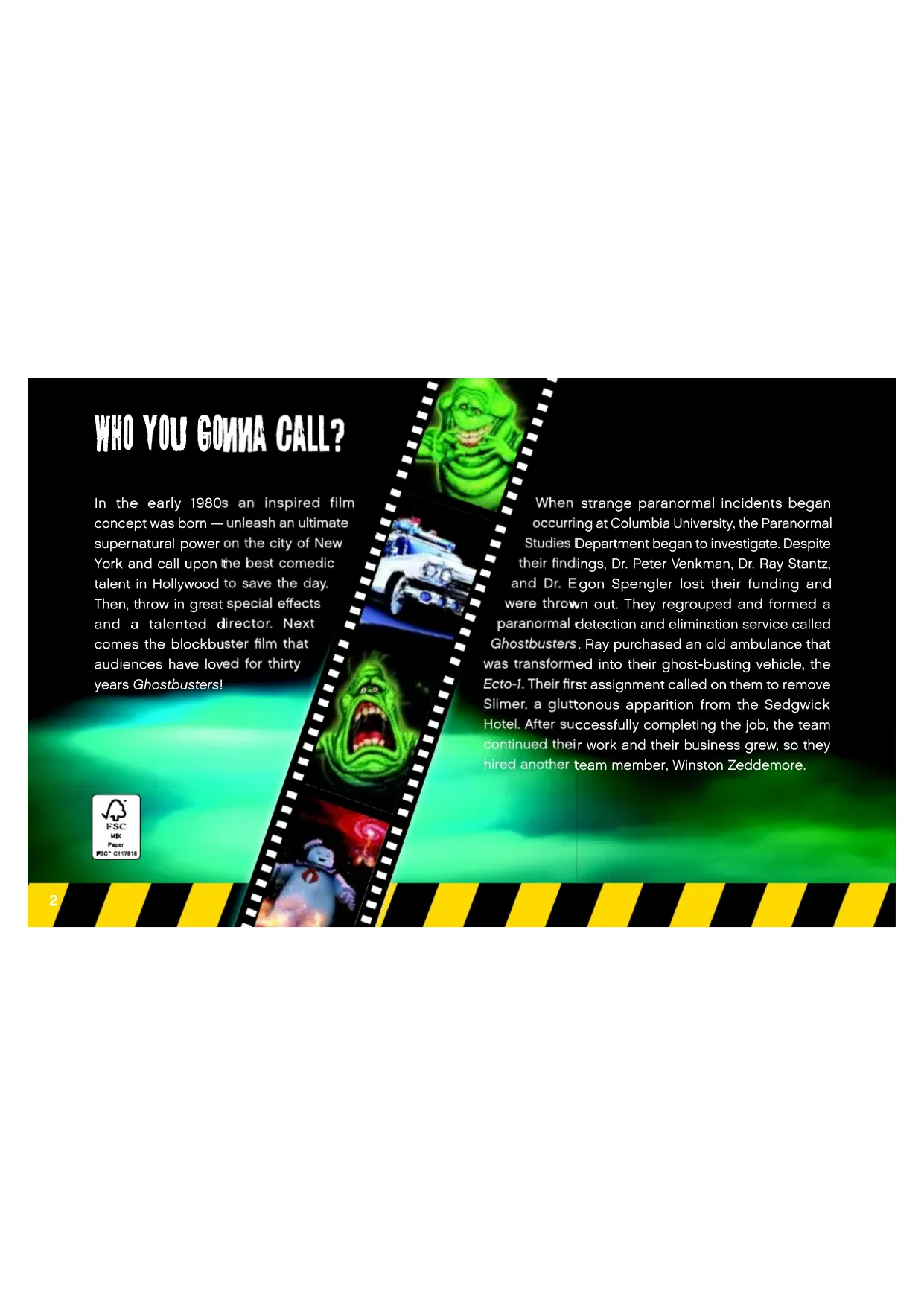 21108_V39_BI_6097686.indd 2 26/02/2014 6:35 PMAll four of them were put to the ultimate test when they had to save New York from Zuul, a paranormal powerhouse. Just when their battle seemed lost, the Ghostbusters made a daring decision to cross the particle streams from their proton packs which resulted in a catastrophic explosion that incinerated the giant Mr. Stay Puft Marshmallow man and destroyed Zuul. Luckily the team survived the blast and the Ghostbusters received praise for saving the city. “Listen! Do you smell something?” “I collect spores, molds, and fungus.” “If there’s a steady paycheck in it, I’ll believe anything you say.” “Back off , man, I’m a scientist.”