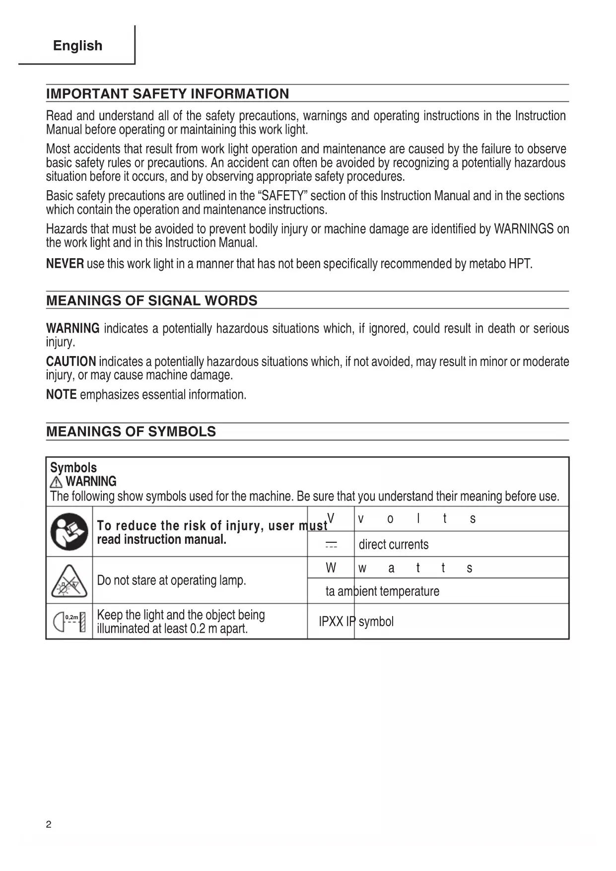 direct currents Do not stare at operating lamp. Wwatts ta ambient temperature 0,2m Keep the light and the object being illuminated at least 0.2 m apart. IPXX IP symbol