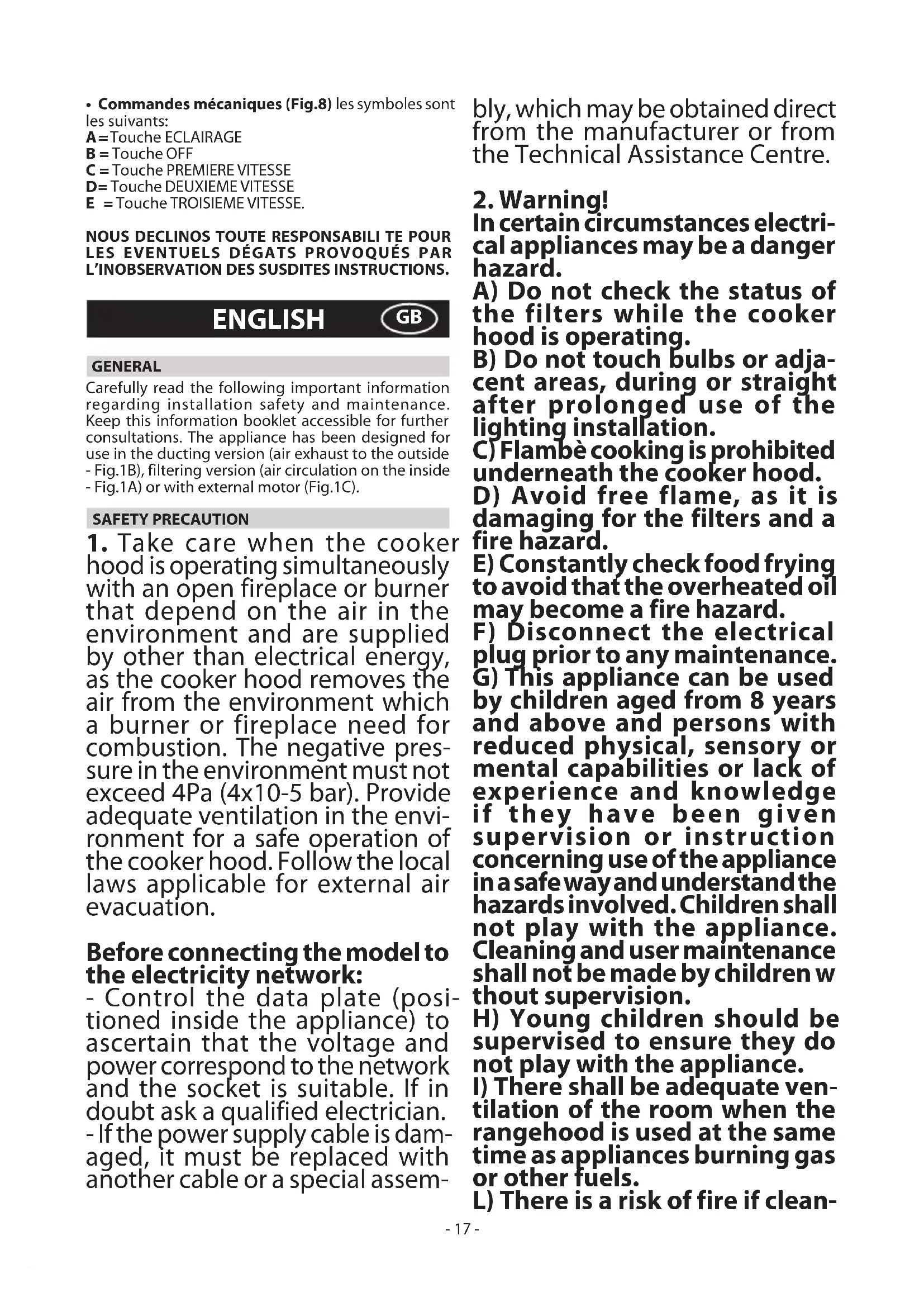 - Attention: the non compliance with the hood cleaning warnings and with the replacement and cleaning of the filters entails risk of fires. One therefore recommends keeping to the suggested instructions.