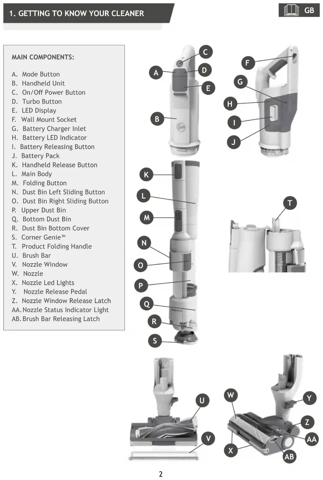 Controls settings: If you require a deeper clean when using your product in Above oor/Handheld mode, press the turbo button to increase the power. The turbo icon will illuminate on the LED display to conrm your selection. Please note this will reduce your battery runtime. To return to standard mode, press the turbo button, the icon on the display will turn o. Please note the Mode button is unavailable for your selection in Above oor/Handheld mode. Accessories included Long exible crevice tool - ideal for accessing deep tight Spaces up above and down below the furniture. Crevice Tools - ideal for accessing tight spaces. 2IN1 Dust Brush - ideal for cleaning surfaces without damaging or scratching. Mini power Nozzle* - ideal for deep cleaning textile surfaces (i.e. sofas) and pet hair removal. To use your product in Corner Genie mode: