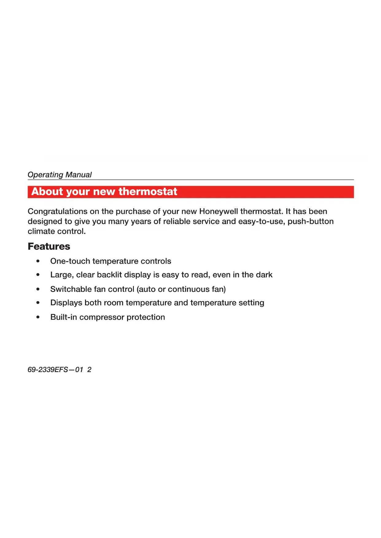 - 1-year limited warranty Table of contentsOperating Manual 69-2339EFS—01 2 Congratulations on the purchase of your new Honeywell thermostat. It has been designed to give you many years of reliable service and easy-to-use, push-button climate control. Features p. 13