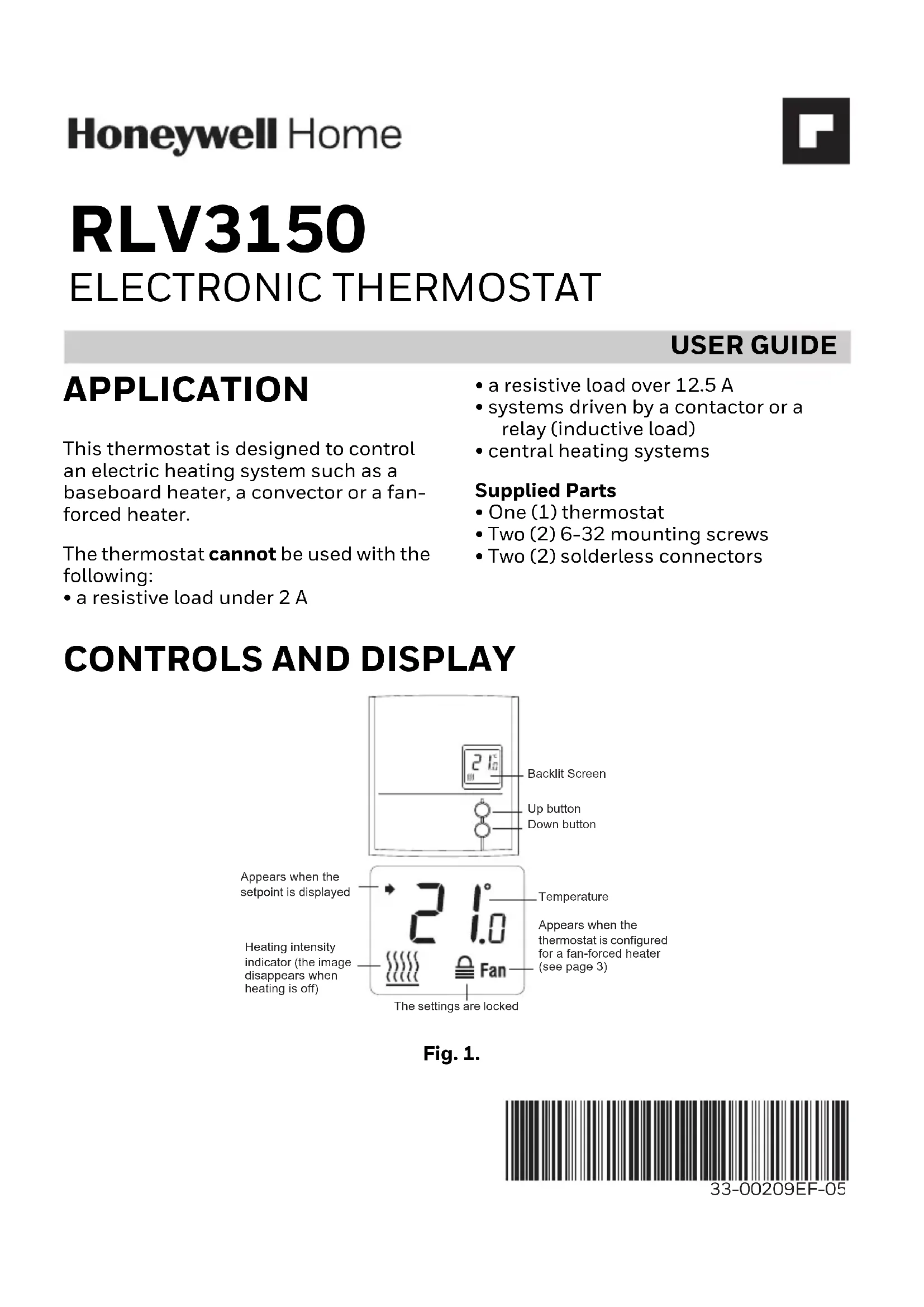 USER GUIDE 33-00209EF-05 RLV3150 ELECTRONIC THERMOSTAT APPLICATION This thermostat is designed to control an electric heating system such as a baseboard heater, a convector or a fan- forced heater. The thermostat cannot be used with the following: