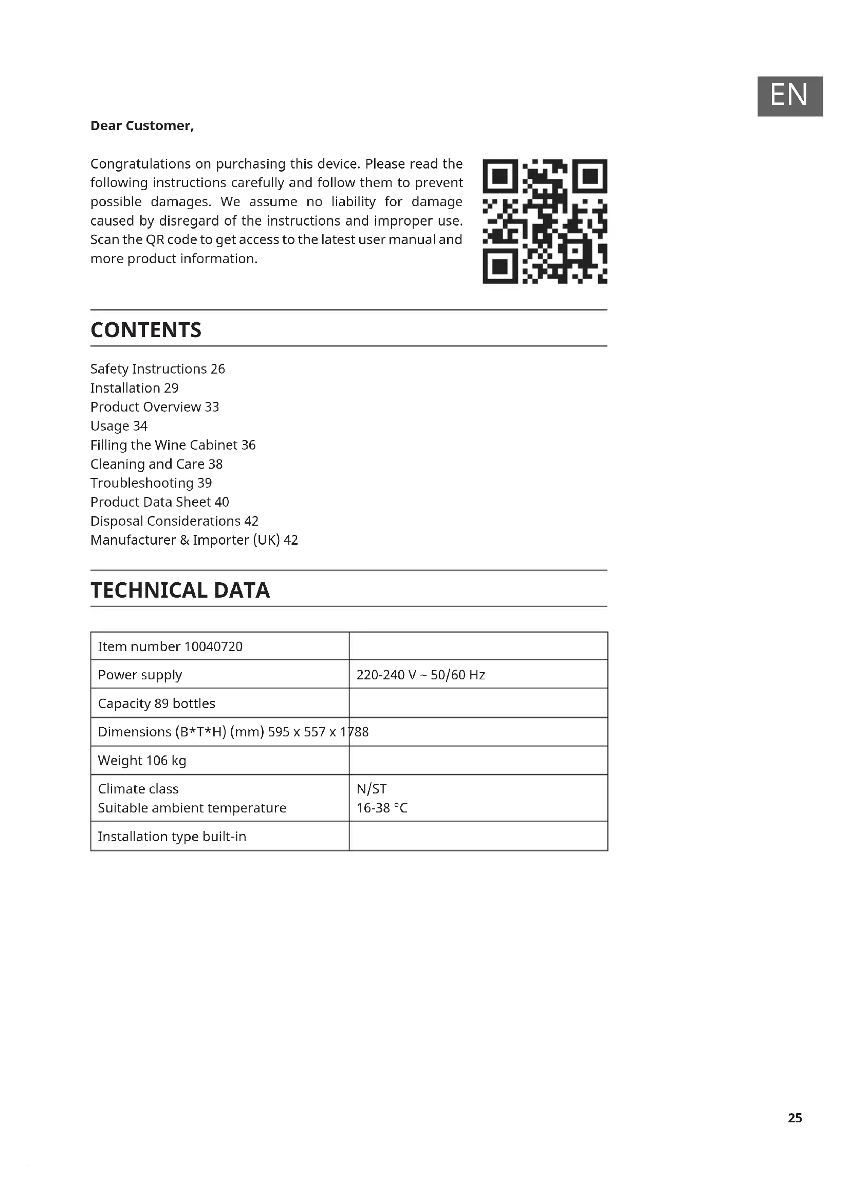 Safety Instructions 26 Installation 29 Product Overview 33 Usage 34 Filling the Wine Cabinet 36 Cleaning and Care 38 Troubleshooting 39 Product Data Sheet 40 Disposal Considerations 42 Manufacturer & Importer (UK) 42 Dear Customer, Congratulations on purchasing this device. Please read the following instructions carefully and follow them to prevent possible damages. We assume no liability for damage caused by disregard of the instructions and improper use. Scan the QR code to get access to the latest user manual and more product information. CONTENTS TECHNICAL DATA Item number 10040720 Power supply 220-240 V ~ 50/60 Hz Capacity 89 bottles Dimensions (B*T*H) (mm) 595 x 557 x 1788 Weight 106 kg Climate class Suitable ambient temperature N/ST 16-38 °C Installation type built-in26