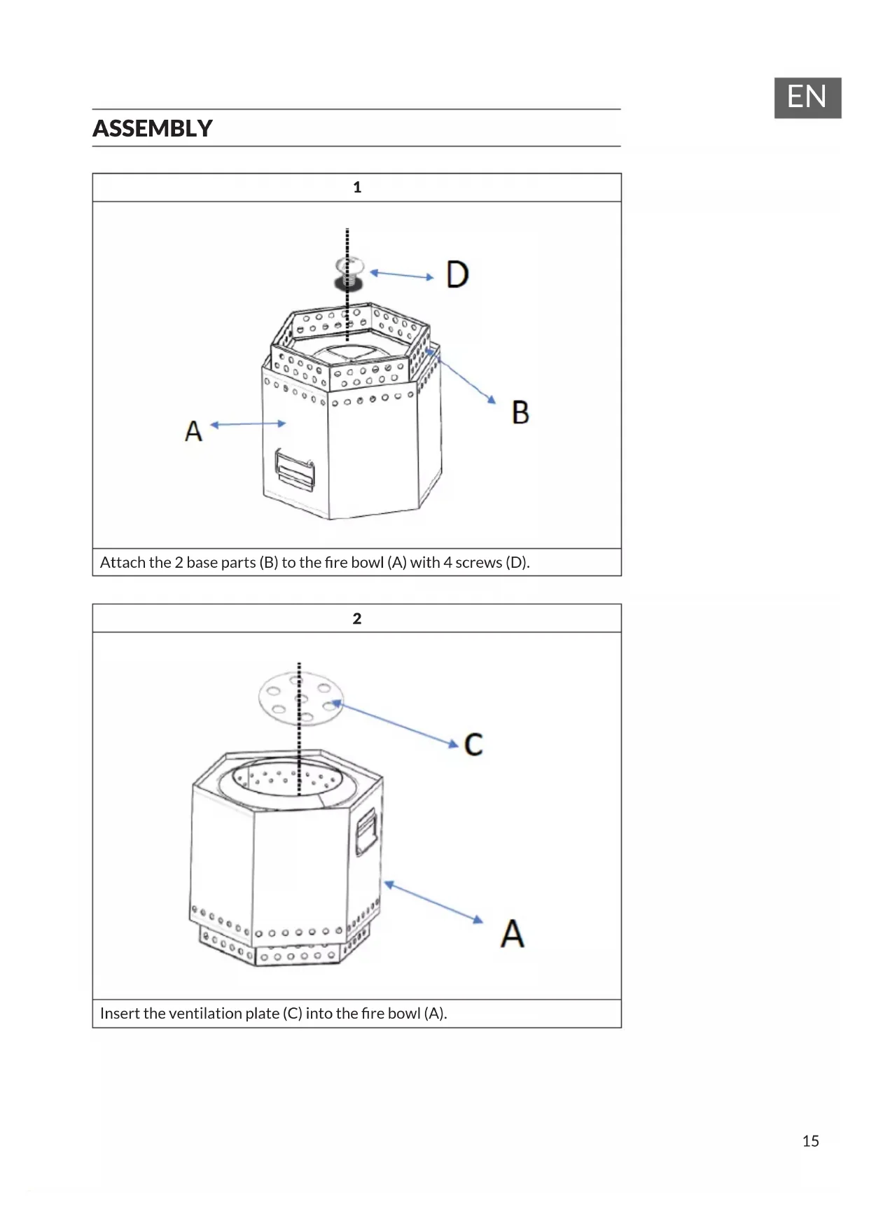 Attach the 2 base parts (B) to the re bowl (A) with 4 screws (D).