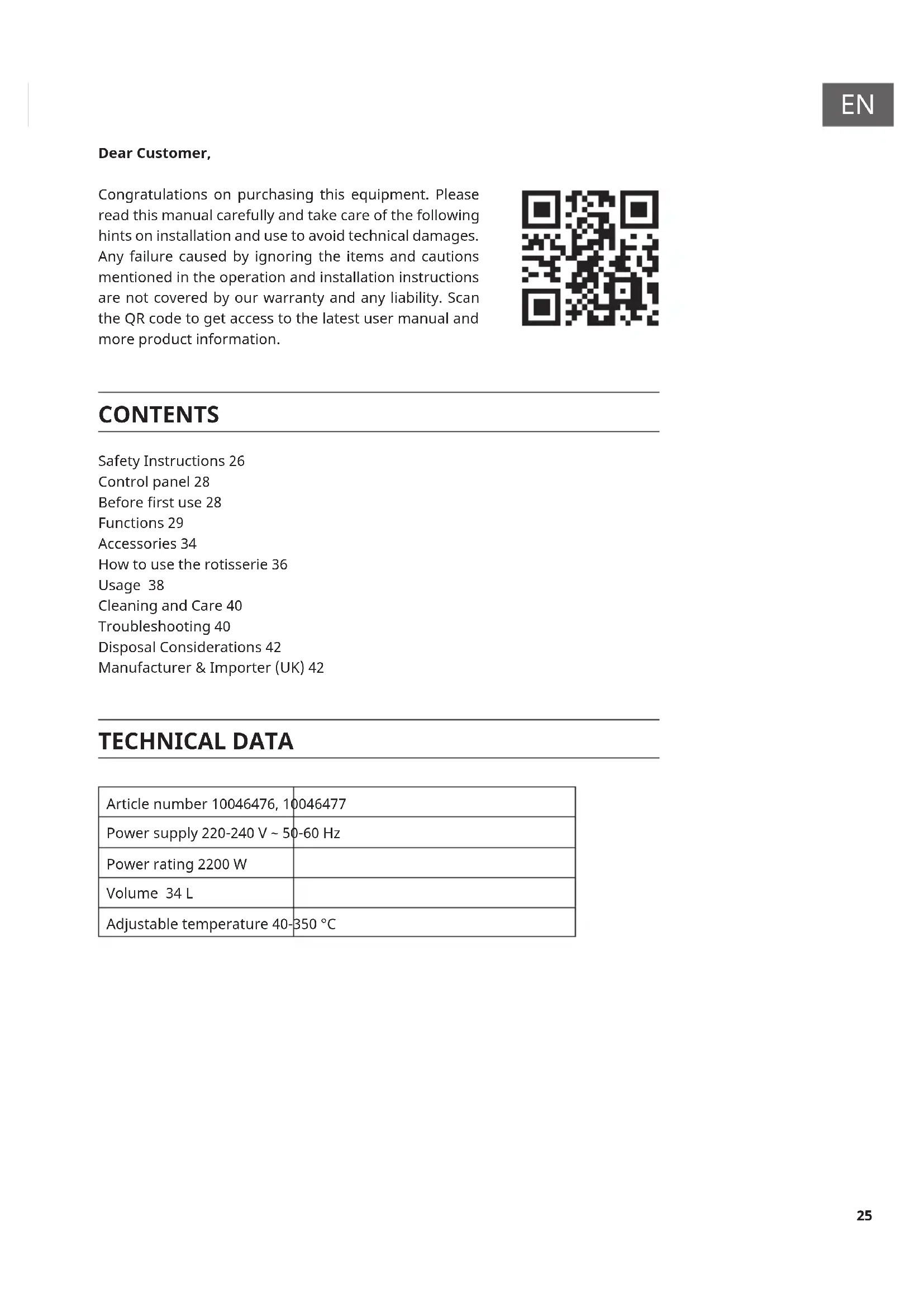 TECHNICAL DATA Article number 10046476, 10046477 Power supply 220-240 V ~ 50-60 Hz Power rating 2200 W Volume 34 L Adjustable temperature 40-350 °C CONTENTS Safety Instructions 26 Control panel 28 Before rst use 28 Functions 29 Accessories 34 How to use the rotisserie 36 Usage 38 Cleaning and Care 40 Troubleshooting 40 Disposal Considerations 42 Manufacturer & Importer (UK) 42 Dear Customer, Congratulations on purchasing this equipment. Please read this manual carefully and take care of the following hints on installation and use to avoid technical damages. Any failure caused by ignoring the items and cautions mentioned in the operation and installation instructions are not covered by our warranty and any liability. Scan the QR code to get access to the latest user manual and more product information.26