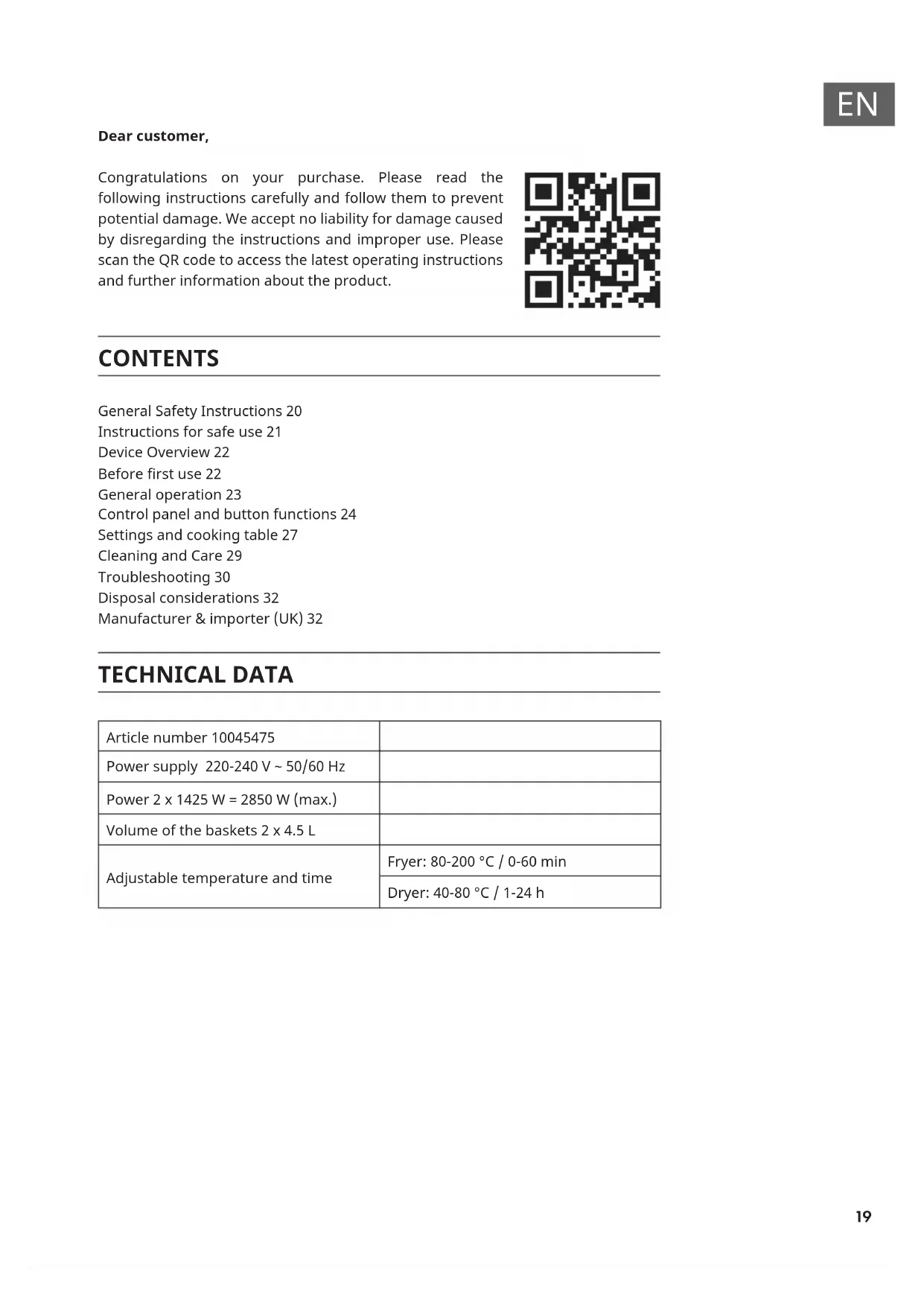 Dear customer, Congratulations on your purchase. Please read the following instructions carefully and follow them to prevent potential damage. We accept no liability for damage caused by disregarding the instructions and improper use. Please scan the QR code to access the latest operating instructions and further information about the product. CONTENTS General Safety Instructions 20 Instructions for safe use 21 Device Overview 22 Before rst use 22 General operation 23 Control panel and button functions 24 Settings and cooking table 27 Cleaning and Care 29 Troubleshooting 30 Disposal considerations 32 Manufacturer & importer (UK) 32 TECHNICAL DATA Article number 10045475 Power supply 220-240 V ~ 50/60 Hz Power 2 x 1425 W = 2850 W (max.) Volume of the baskets 2 x 4.5 L Adjustable temperature and time Fryer: 80-200 °C / 0-60 min Dryer: 40-80 °C / 1-24 h20