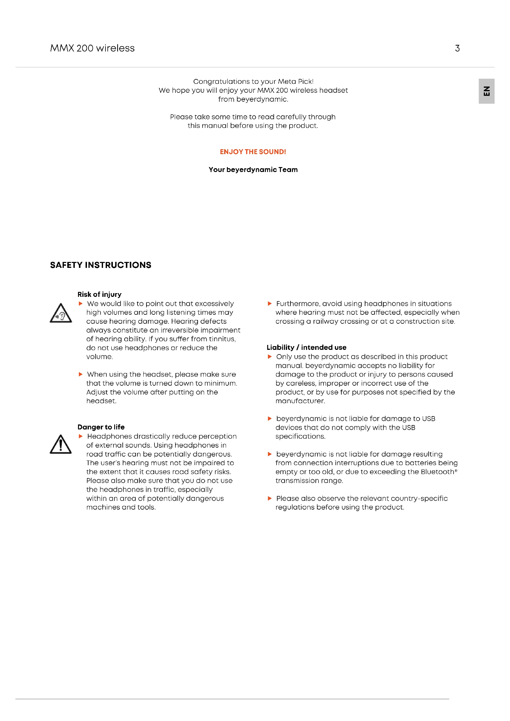 Congratulations to your Meta Pick! We hope you will enjoy your MMX 200 wireless headset from beyerdynamic. Please take some time to read carefully through this manual before using the product. ENJOY THE SOUND! Your beyerdynamic Team Risk of injury We would like to point out that excessively high volumes and long liening times may cause hearing damage. Hearing defects always conitute an irreversible impairment of hearing ability. If you suer from tinnitus, do not use headphones or reduce the volume. When using the headset, please make sure that the volume is turned down to minimum. Adju the volume aer putting on the headset. Danger to life Headphones draically reduce perception of external sounds. Using headphones in road traic can be potentially dangerous. The user’s hearing mu not be impaired to the extent that it causes road safety risks. Please also make sure that you do not use the headphones in traic, especially within an area of potentially dangerous machines and tools. SAFETY INSTRUCTIONS Fuhermore, avoid using headphones in situations where hearing mu not be aected, especially when crossing a railway crossing or at a conruction site. Liability / intended use Only use the product as described in this product manual. beyerdynamic accepts no liability for damage to the product or injury to persons caused by careless, improper or incorrect use of the product, or by use for purposes not specified by the manufacturer. beyerdynamic is not liable for damage to USB devices that do not comply with the USB specifications. beyerdynamic is not liable for damage resulting from connection interruptions due to batteries being empty or too old, or due to exceeding the Bluetooth® transmission range. Please also observe the relevant country-specific regulations before using the product.MMX 200 wireless