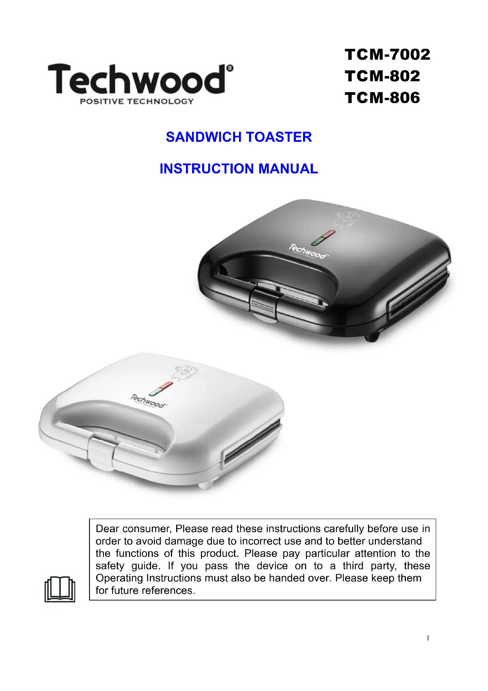 SANDWICH TOASTER INSTRUCTION MANUAL Dear consumer, Please read these instructions carefully before use in order to avoid damage due to incorrect use and to better understand the functions of this product. Please pay particular attention to the safety guide. If you pass the device on to a third party, these Operating Instructions must also be handed over. Please keep them for future references.