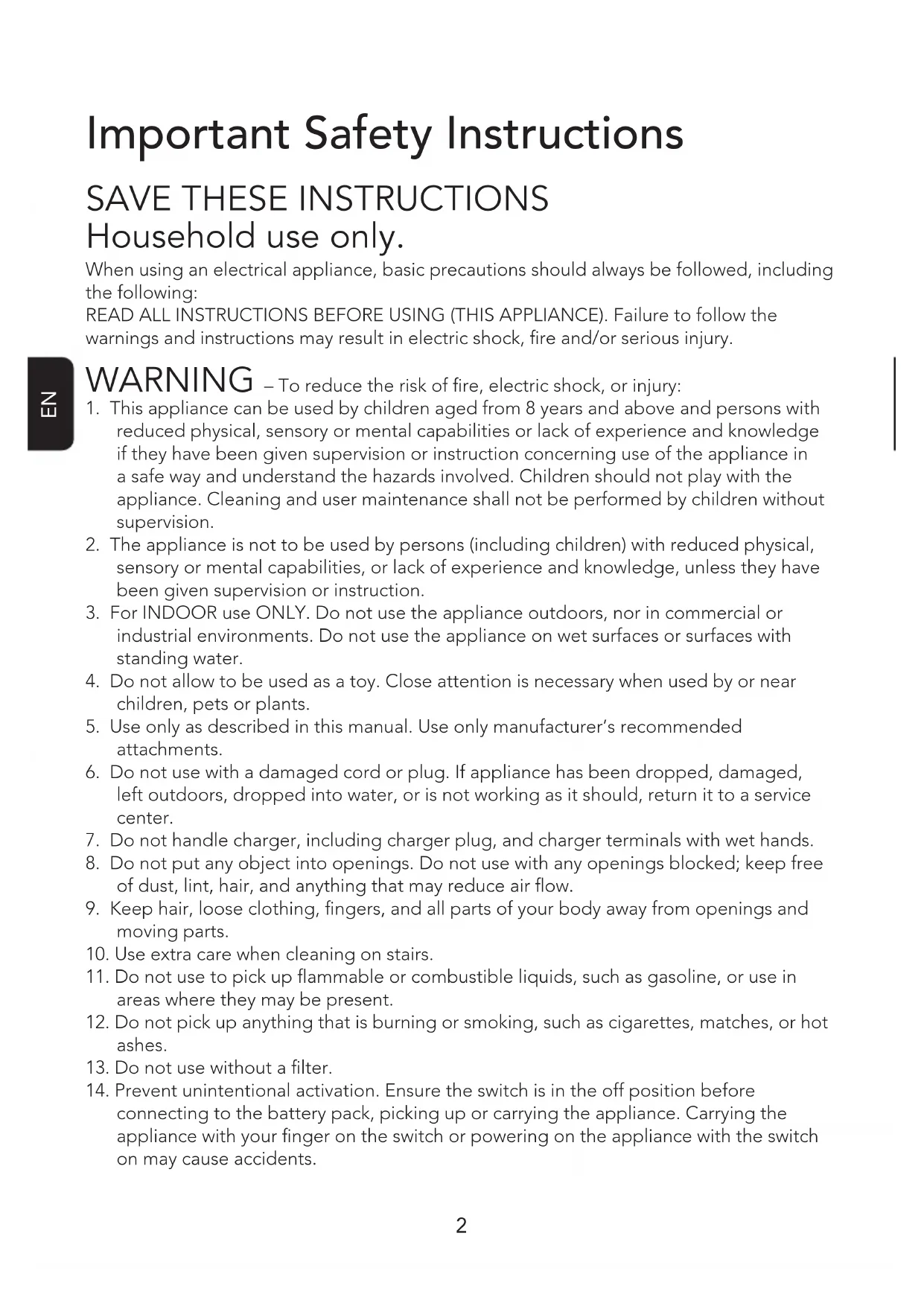 Household use only. When using an electrical appliance, basic precautions should always be followed, including the following: READ ALL INSTRUCTIONS BEFORE USING (THIS APPLIANCE). Failure to follow the warnings and instructions may result in electric shock, re and/or serious injury. WARNING – To reduce the risk of re, electric shock, or injury:
