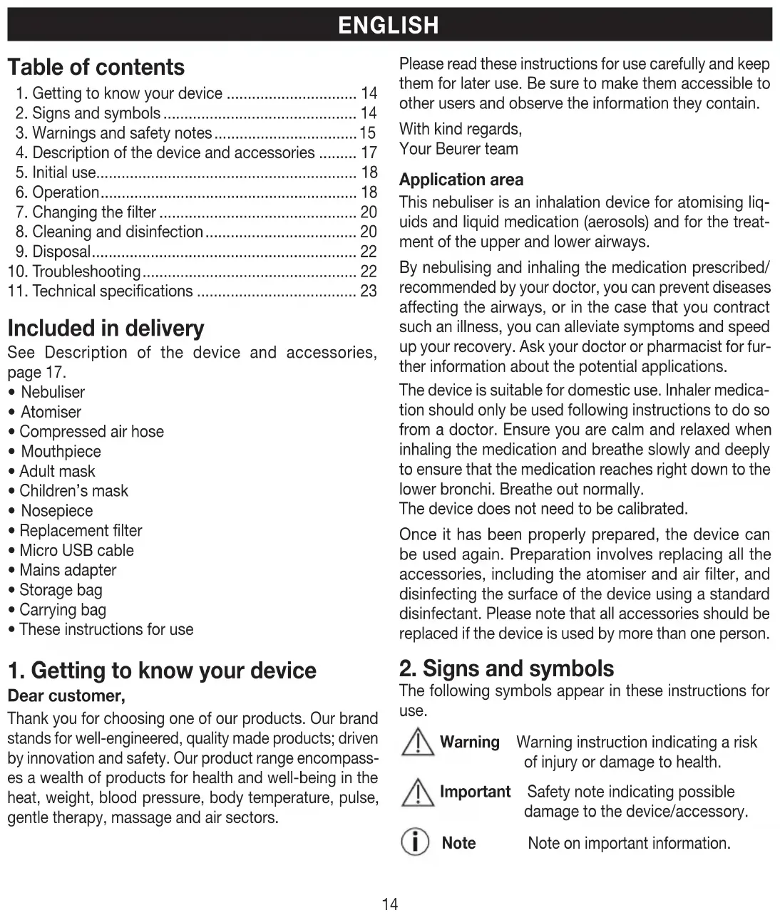 Dear customer, Thank you for choosing one of our products. Our brand stands for well-engineered, quality made products; driven by innovation and safety. Our product range encompass- es a wealth of products for health and well-being in the heat, weight, blood pressure, body temperature, pulse, gentle therapy, massage and air sectors. Please read these instructions for use carefully and keep them for later use. Be sure to make them accessible to other users and observe the information they contain. With kind regards, Your Beurer team Application area This nebuliser is an inhalation device for atomising liq- uids and liquid medication (aerosols) and for the treat- ment of the upper and lower airways. By nebulising and inhaling the medication prescribed/ recommended by your doctor, you can prevent diseases affecting the airways, or in the case that you contract such an illness, you can alleviate symptoms and speed up your recovery. Ask your doctor or pharmacist for fur- ther information about the potential applications. The device is suitable for domestic use. Inhaler medica- tion should only be used following instructions to do so from a doctor. Ensure you are calm and relaxed when inhaling the medication and breathe slowly and deeply to ensure that the medication reaches right down to the lower bronchi. Breathe out normally. The device does not need to be calibrated. Once it has been properly prepared, the device can be used again. Preparation involves replacing all the accessories, including the atomiser and air filter, and disinfecting the surface of the device using a standard disinfectant. Please note that all accessories should be replaced if the device is used by more than one person.