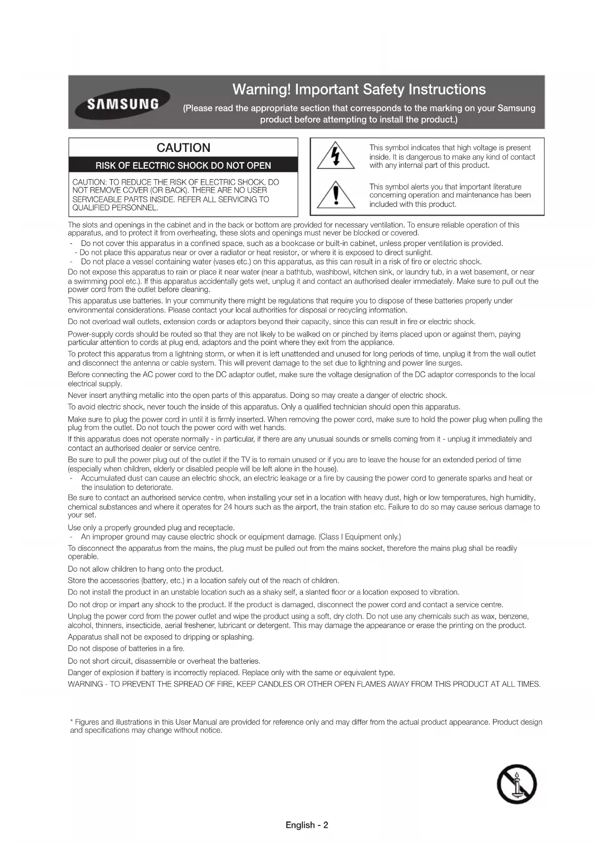 www.samsung.com/africa_fr/supportSENEGAL 800-00-0077 CAMEROON 7095- 0077 KENYA 0800 545 545 www.samsung.com/support UGANDA 0800 300 300 TANZANIA 0685 88 99 00 RWANDA 9999 BURUNDI 200 DRC 499999 SUDAN 1969 SOUTH AFRICA 0860-SAMSUNG (726-7864) www.samsung.com/support BOTSWANA 8007260000 NAMIBIA 08 197 267 864 ZAMBIA 0211 350370 MOZAMBIQUE 847267864 / 827267864 ALGERIA 021 36 11 00 www.samsung.com/n_africa/support TUNISIA 80-1000-12 www.samsung.com/n_africa/support user manual Thank you for purchasing this Samsung product. To receive more complete service, please register your product at www.samsung.com/register Model ________Serial No. ___________ Ultra High Definition [HU8500-SH]BN68-06099A-02L04.indb 1 2014-04-18 10:58:30English - 2 Warning! Important Safety Instructions (Please read the appropriate section that corresponds to the marking on your Samsung product before attempting to install the product.) CAUTION RISK OF ELECTRIC SHOCK DO NOT OPEN CAUTION: TO REDUCE THE RISK OF ELECTRIC SHOCK, DO NOT REMOVE COVER (OR BACK). THERE ARE NO USER SERVICEABLE PARTS INSIDE. REFER ALL SERVICING TO QUALIFIED PERSONNEL. This symbol indicates that high voltage is present inside. It is dangerous to make any kind of contact with any internal part of this product. This symbol alerts you that important literature concerning operation and maintenance has been included with this product. The slots and openings in the cabinet and in the back or bottom are provided for necessary ventilation. To ensure reliable operation of this apparatus, and to protect it from overheating, these slots and openings must never be blocked or covered. - Do not cover this apparatus in a confined space, such as a bookcase or built-in cabinet, unless proper ventilation is provided. - Do not place this apparatus near or over a radiator or heat resistor, or where it is exposed to direct sunlight. - Do not place a vessel containing water (vases etc.) on this apparatus, as this can result in a risk of fire or electric shock. Do not expose this apparatus to rain or place it near water (near a bathtub, washbowl, kitchen sink, or laundry tub, in a wet basement, or near a swimming pool etc.). If this apparatus accidentally gets wet, unplug it and contact an authorised dealer immediately. Make sure to pull out the power cord from the outlet before cleaning. This apparatus use batteries. In your community there might be regulations that require you to dispose of these batteries properly under environmental considerations. Please contact your local authorities for disposal or recycling information. Do not overload wall outlets, extension cords or adaptors beyond their capacity, since this can result in fire or electric shock. Power-supply cords should be routed so that they are not likely to be walked on or pinched by items placed upon or against them, paying particular attention to cords at plug end, adaptors and the point where they exit from the appliance. To protect this apparatus from a lightning storm, or when it is left unattended and unused for long periods of time, unplug it from the wall outlet and disconnect the antenna or cable system. This will prevent damage to the set due to lightning and power line surges. Before connecting the AC power cord to the DC adaptor outlet, make sure the voltage designation of the DC adaptor corresponds to the local electrical supply. Never insert anything metallic into the open parts of this apparatus. Doing so may create a danger of electric shock. To avoid electric shock, never touch the inside of this apparatus. Only a qualified technician should open this apparatus. Make sure to plug the power cord in until it is firmly inserted. When removing the power cord, make sure to hold the power plug when pulling the plug from the outlet. Do not touch the power cord with wet hands. If this apparatus does not operate normally - in particular, if there are any unusual sounds or smells coming from it - unplug it immediately and contact an authorised dealer or service centre. Be sure to pull the power plug out of the outlet if the TV is to remain unused or if you are to leave the house for an extended period of time (especially when children, elderly or disabled people will be left alone in the house). - Accumulated dust can cause an electric shock, an electric leakage or a fire by causing the power cord to generate sparks and heat or the insulation to deteriorate. Be sure to contact an authorised service centre, when installing your set in a location with heavy dust, high or low temperatures, high humidity, chemical substances and where it operates for 24 hours such as the airport, the train station etc. Failure to do so may cause serious damage to your set. Use only a properly grounded plug and receptacle. - An improper ground may cause electric shock or equipment damage. (Class l Equipment only.) To disconnect the apparatus from the mains, the plug must be pulled out from the mains socket, therefore the mains plug shall be readily operable. Do not allow children to hang onto the product. Store the accessories (battery, etc.) in a location safely out of the reach of children. Do not install the product in an unstable location such as a shaky self, a slanted floor or a location exposed to vibration. Do not drop or impart any shock to the product. If the product is damaged, disconnect the power cord and contact a service centre. Unplug the power cord from the power outlet and wipe the product using a soft, dry cloth. Do not use any chemicals such as wax, benzene, alcohol, thinners, insecticide, aerial freshener, lubricant or detergent. This may damage the appearance or erase the printing on the product. Apparatus shall not be exposed to dripping or splashing. Do not dispose of batteries in a fire. Do not short circuit, disassemble or overheat the batteries. Danger of explosion if battery is incorrectly replaced. Replace only with the same or equivalent type. WARNING - TO PREVENT THE SPREAD OF FIRE, KEEP CA