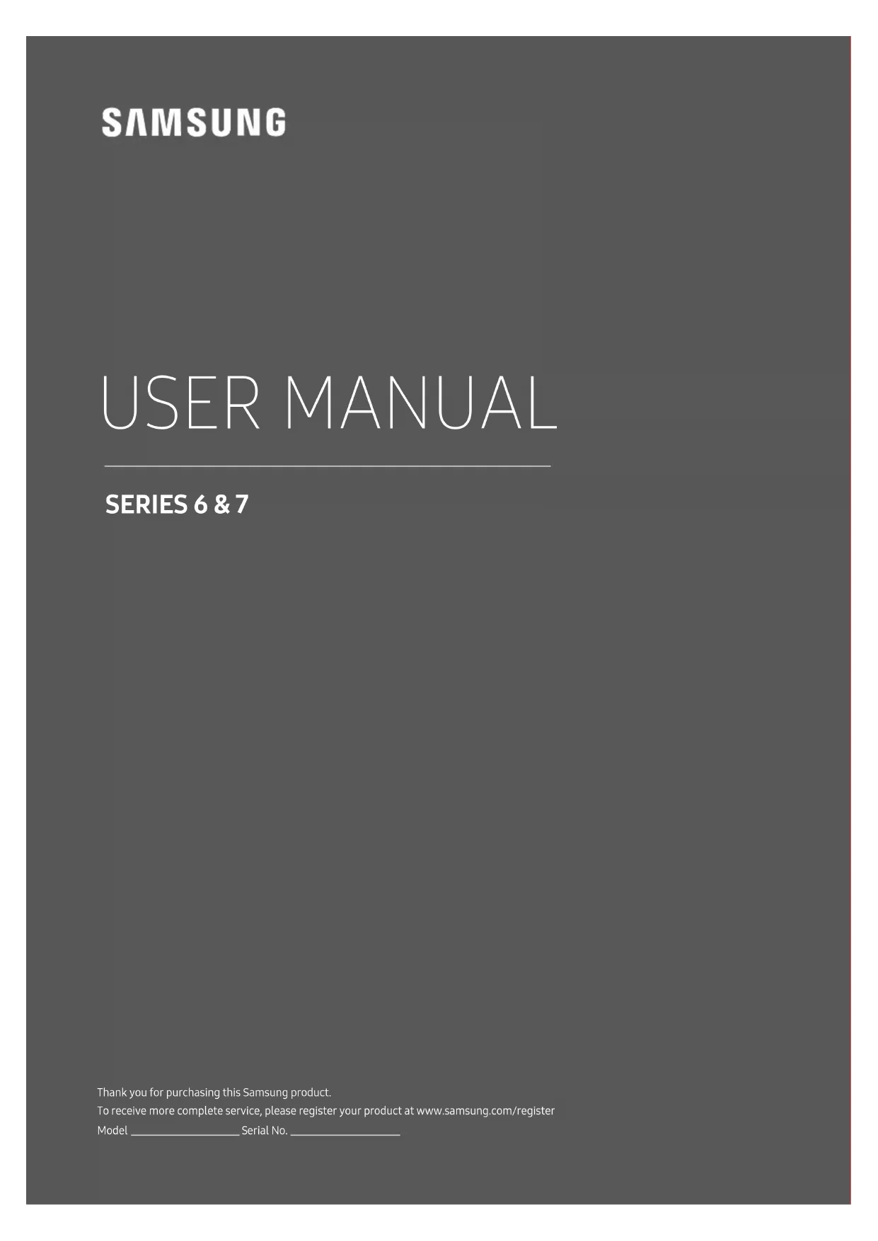 SERIES 6 & 7 Thank you for purchasing this Samsung product. To receive more complete service, please register your product at www.samsung.com/register Model Serial No. USER MANUALEnglish - 2 Before Reading This User Manual This TV comes with this user manual and an embedded e-Manual. Before reading this user manual, review the following: User Manual Read this provided user manual to see information about product safety, installation, accessories, initial conguration, and product specications. e-Manual For more information about this TV, read the e-Manual embedded in the product.