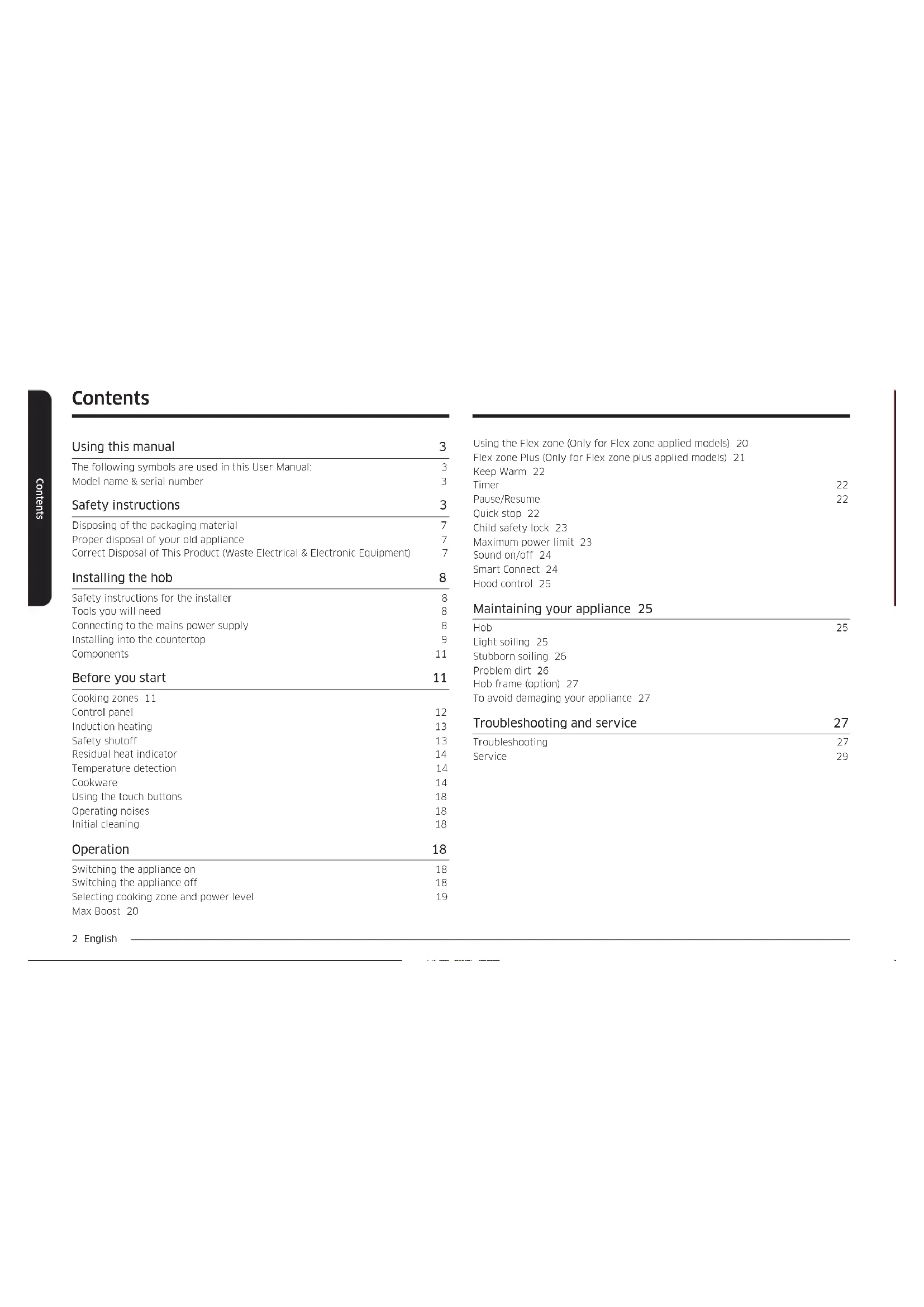 Induction Hob User manual NZ64B6056** / NZ64B6058** NZ63B6056** / NZ63B6058**2 English Contents Contents Using the Flex zone (Only for Flex zone applied models) 20 Flex zone Plus (Only for Flex zone plus applied models) 21 Keep Warm 22 Timer 22 Pause/Resume 22 Quick stop 22 Child safety lock 23 Maximum power limit 23 Sound on/off 24 Smart Connect 24 Hood control 25 Maintaining your appliance 25 Hob 25 Light soiling 25 Stubborn soiling 26 Problem dirt 26 Hob frame (option) 27 To avoid damaging your appliance 27 Troubleshooting and service 27 Troubleshooting 27 Service 29 Contents Using this manual 3 The following symbols are used in this User Manual: 3 Model name & serial number 3 Safety instructions 3 Disposing of the packaging material 7 Proper disposal of your old appliance 7 Correct Disposal of This Product (Waste Electrical & Electronic Equipment) 7 Installing the hob 8 Safety instructions for the installer 8 Tools you will need 8 Connecting to the mains power supply 8 Installing into the countertop 9 Components 11 Before you start 11 Cooking zones 11 Control panel 12 Induction heating 13 Safety shutoff 13 Residual heat indicator 14 Temperature detection 14 Cookware 14 Using the touch buttons 18 Operating noises 18 Initial cleaning 18 Operation 18 Switching the appliance on 18 Switching the appliance off 18 Selecting cooking zone and power level 19 Max Boost 20English 3 Using this manual Using this manual Please take the time to read this owner’s manual, paying particular attention to the safety information contained in the following section, before using your appliance. Keep this manual for future reference. If transferring ownership of the appliance, please remember to pass the manual on to the new owner. The following symbols are used in this User Manual: WARNING Hazards or unsafe practices that may result in severe personal injury or death. CAUTION Hazards or unsafe practices that may result in minor personal injury or property damage. CAUTION To reduce the risk of re, explosion, electric shock, or personal injury when using your hob, follow these basic safety precaution. NOTE Useful tips, recommendations, or information that helps users manipulate the product. Model name & serial number Both the model name and the serial number are labeled underneath the hob base. For later use, write down the information or attach the additional product label (located on the top of the product) onto the current page. Model Name Serial Number Safety instructions The safety aspects of this appliance comply with all accepted technical and safety standards. However, as manufacturers we also believe it is our responsibility to familiarize you with the following safety instructions. WARNING This appliance is not intended for use by persons (including children) with reduced physical, sensory or mental capabilities, or lack of experience and knowledge, unless they have been given supervision or instruction concerning use of the appliance by a person responsible for their safety. Children should be supervised to ensure that they do not play with the appliance. This appliance can be used by children aged from 8 years and above and persons with reduced physical, sensory or mental capabilities or lack of experience and knowledge if they have been given supervision or instruction concerning use of the appliance in a safe way and understand the hazards involved. Children shall not play with the appliance. Cleaning and user maintenance shall not be made by children without supervision. The means for disconnection must be incorporated in the xed wiring in accordance with the wiring rules.4 English Safety instructions Safety instructions The appliance is not intended to be operated by means of an external timer or separate remote-control system. CAUTION: The cooking process has to be supervised. A short term cooking process has to be supervised continuously. The appliance must not be installed behind a decorative door in order to avoid overheating.