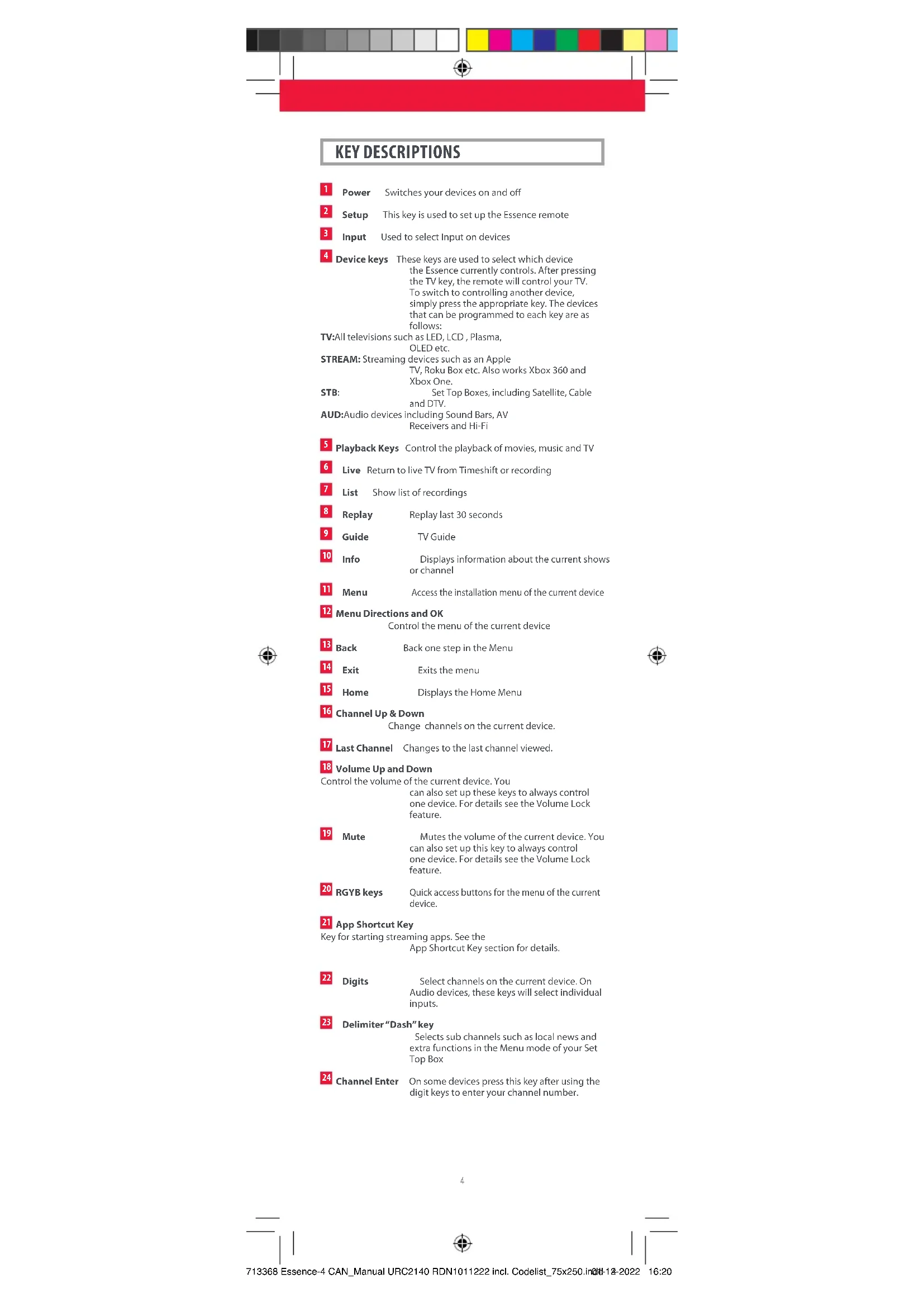 Channel Enter On some devices press this key after using the digit keys to enter your channel number. KEY DESCRIPTIONS 713368 Essence-4 CAN_Manual URC2140 RDN1011222 incl. Codelist_75x250.indd 4713368 Essence-4 CAN_Manual URC2140 RDN1011222 incl. Codelist_75x250.indd 401-12-2022 16:2001-12-2022 16:205 The Essence remote is pre-programmed to control some of the most popular devices out of the box. If you have one of the following devices try the putting the batteries in and pressing the device key, and then press a few keys to see if the remote works your device: Device Key To Press Device controlled TV Samsung TV STREAM Roku Streaming Box STB Comcast Set top box AUDIO Yamaha Receiver If your device is not one of those listed above, or you have extra devices to set up, there are 3 ways to do this. The easiest is SimpleSet which is used for the common brands and devices. If the brand of your device is shown in the SimpleSet list next to a digit key, you can use the SimpleSet system described in this section, please locate the brand of your device and note the key associated with it.