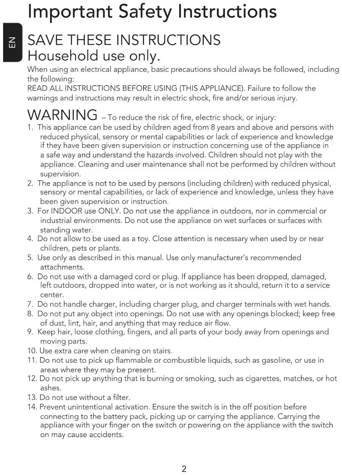 connecting to the battery pack, picking up or carrying the appliance. Carrying the appliance with your nger on the switch or powering on the appliance with the switch on may cause accidents. Important Safety InstructionsEN