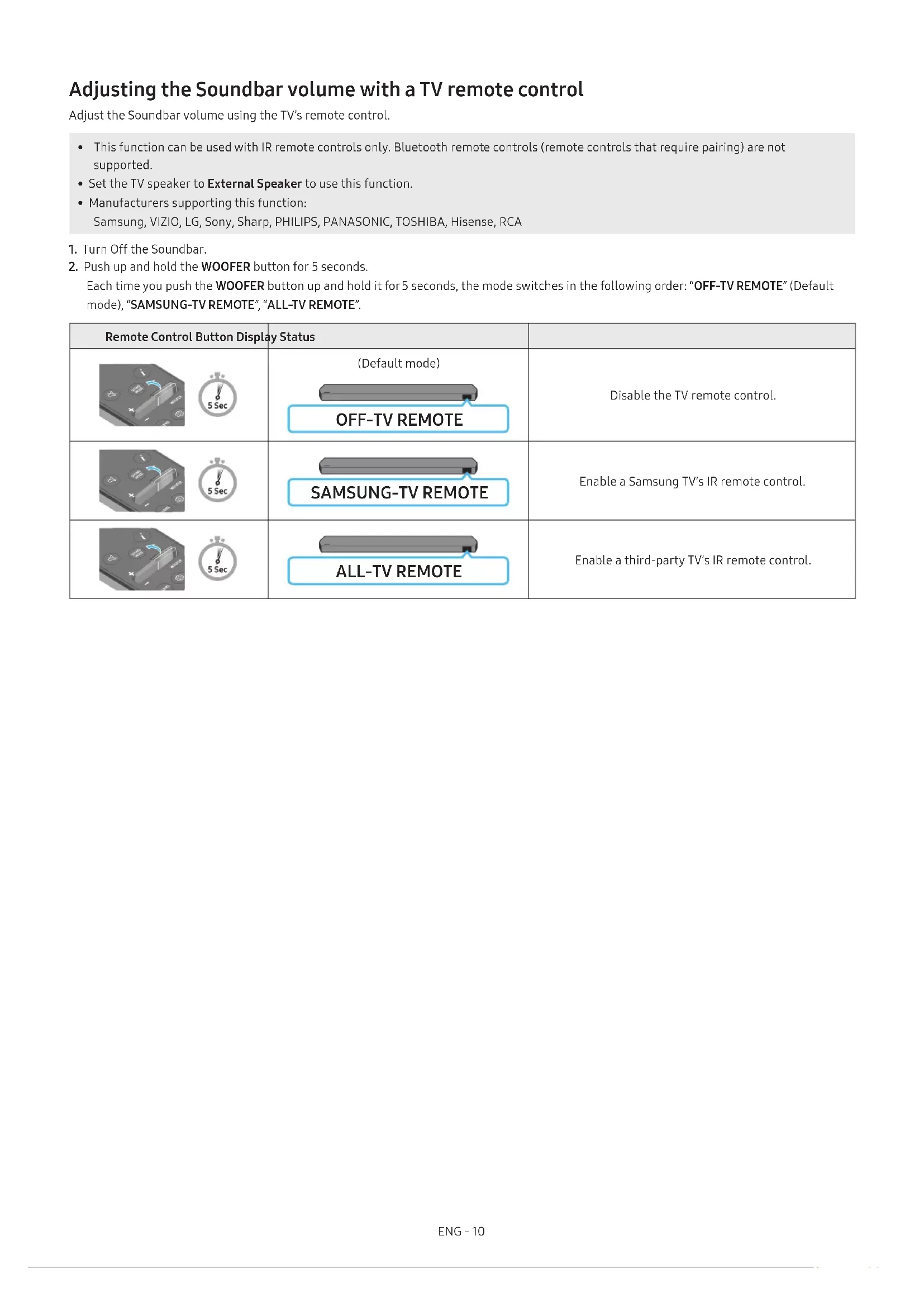 Each time you push the WOOFER button up and hold it for 5 seconds, the mode switches in the following order: “OFF-TV REMOTE” (Default mode), “SAMSUNG-TV REMOTE”, “ALL-TV REMOTE”. Remote Control Button Display Status (Default mode) OFF-TV REMOTE Disable the TV remote control. SAMSUNG-TV REMOTE Enable a Samsung TV’s IR remote control. ALL-TV REMOTE Enable a third-party TV’s IR remote control.ENG - 11