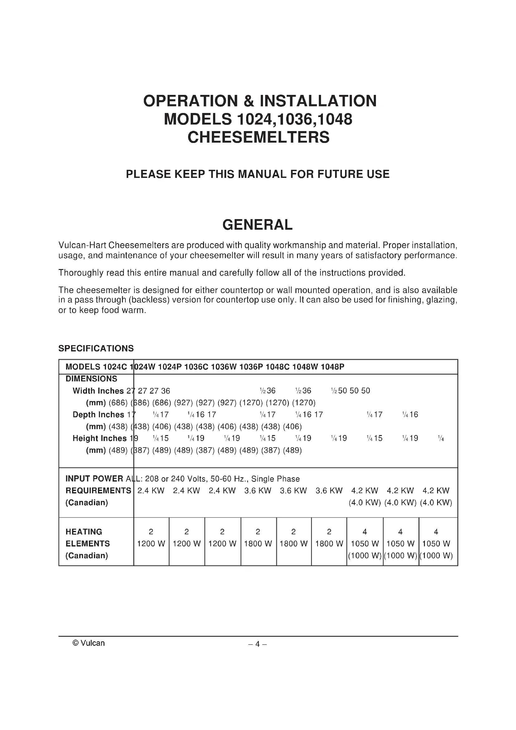 1.If the pilot light does not come on, and the cooling fan does not run, check for a blown fuse or an open circuit breaker. 2.If the pilot light is lit, and the cooling fan is running, but the heaters do not light, the cheesemelter may be in standby. When cheesemelter is in standby with no product on the rack, the heaters may not glow, but will still emit some heat. 3.If one heater is lit, but the other is not, a burnout or a loose connection is the probable cause. Contact your local Hobart Food Equipment Group office. IF THE COOLING FAN DOES NOT RUN 1.If the pilot light is not lit, and the heaters do not light, check for a blown fuse or an open circuit breaker. 2.If the pilot light is lit and the heaters function, the probable cause is a loose connection. Contact your local Hobart Food Equipment Group office. © Vulcan– 12 – NOTES © VulcanMODE D’EMPLOI SALAMANDRES 1024, 1036, 1048 MODÈLES: 1024C ML-103833 1024W ML-103834 1024P ML-103835 1036C ML-103836 1036W ML-103837 1036P ML-103838 1048C ML-103839 Canadian ML-126600 1048W ML-103840 Canadian ML-126602 1048P ML-103841 Canadian ML-126601