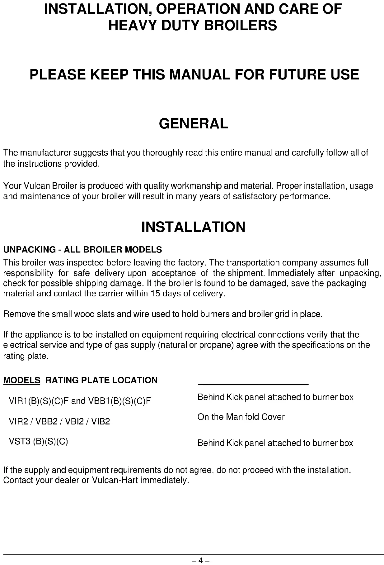 PLEASE KEEP THIS MANUAL FOR FUTURE USE GENERAL The manufacturer suggests that you thoroughly read this entire manual and carefully follow all of the instructions provided. Your Vulcan Broiler is produced with quality workmanship and material. Proper installation, usage and maintenance of your broiler will result in many years of satisfactory performance. INSTALLATION UNPACKING - ALL BROILER MODELS This broiler was inspected before leaving the factory. The transportation company assumes full responsibility for safe delivery upon acceptance of the shipment. Immediately after unpacking, check for possible shipping damage. If the broiler is found to be damaged, save the packaging material and contact the carrier within 15 days of delivery. Remove the small wood slats and wire used to hold burners and broiler grid in place. If the appliance is to be installed on equipment requiring electrical connections verify that the electrical service and type of gas supply (natural or propane) agree with the specifications on the rating plate.