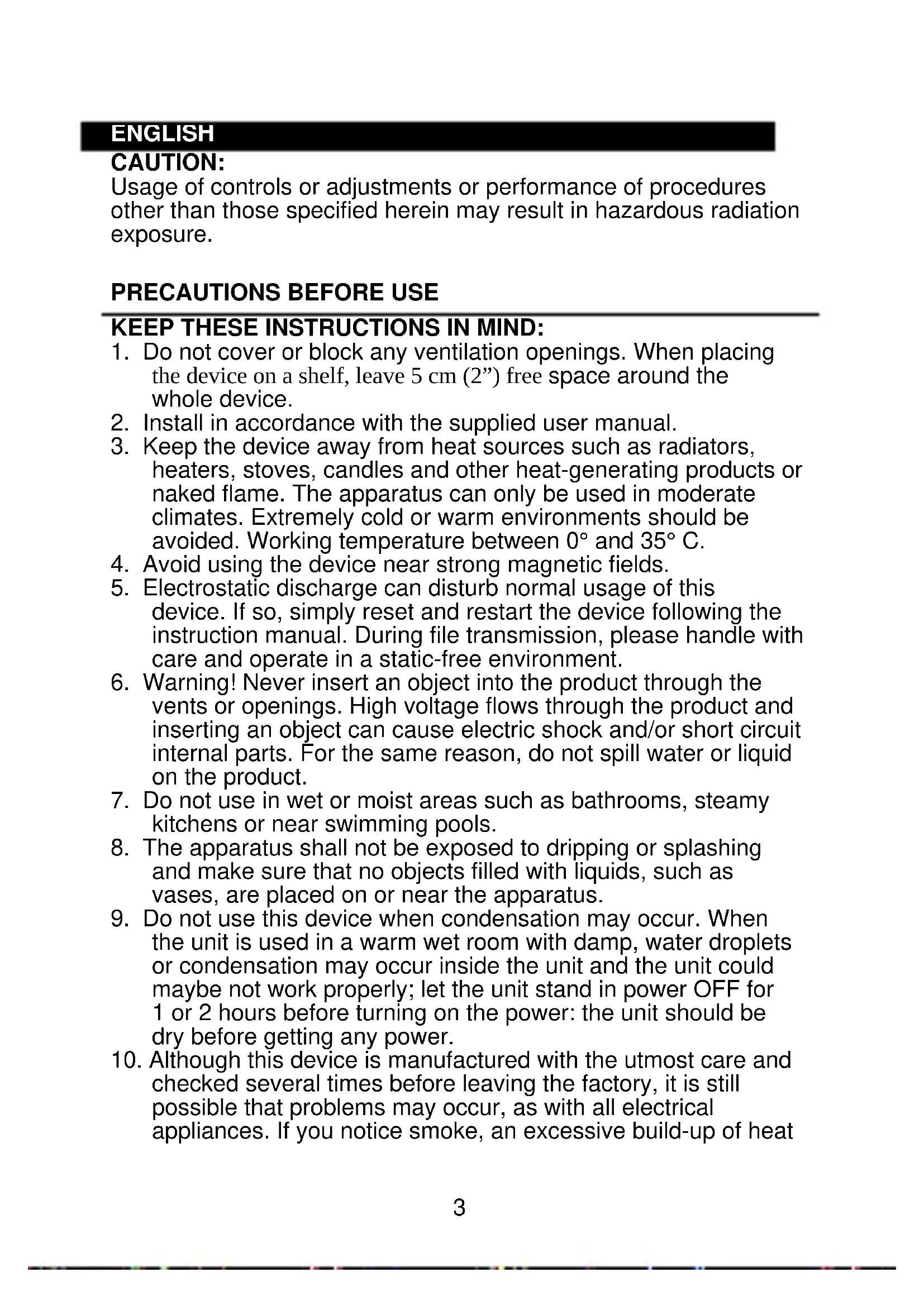 heaters, stoves, candles and other heat-generating products or naked flame. The apparatus can only be used in moderate climates. Extremely cold or warm environments should be avoided. Working temperature between 0° and 35° C.
