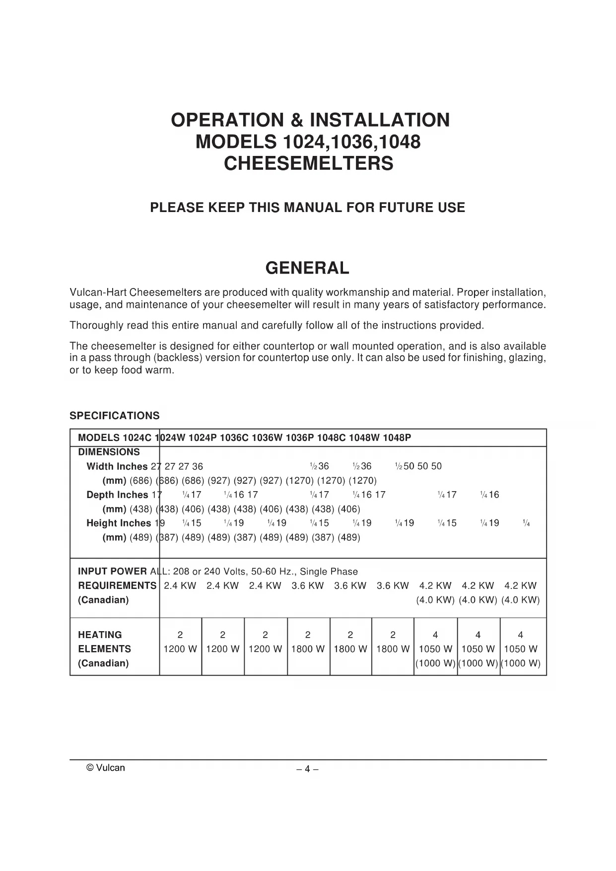 LOCATION Do not install pass through cheesemelters on a wall. Pass through cheesemelters must be installed with adequate clearances for servicing and proper operation. Do not operate countertop and pass through cheesemelters without the legs in place. Damage to the countertop may result. It is recommended that the cheesemelter not be installed directly over or directly adjacent to charbroilers, griddles or fryer banks. Quartz elements can be susceptible to the effects of grease laden smoke and installation in these locations may shorten element life. The cheesemelter must be installed so that it is level side to side and front to back © Vulcan– 6 –