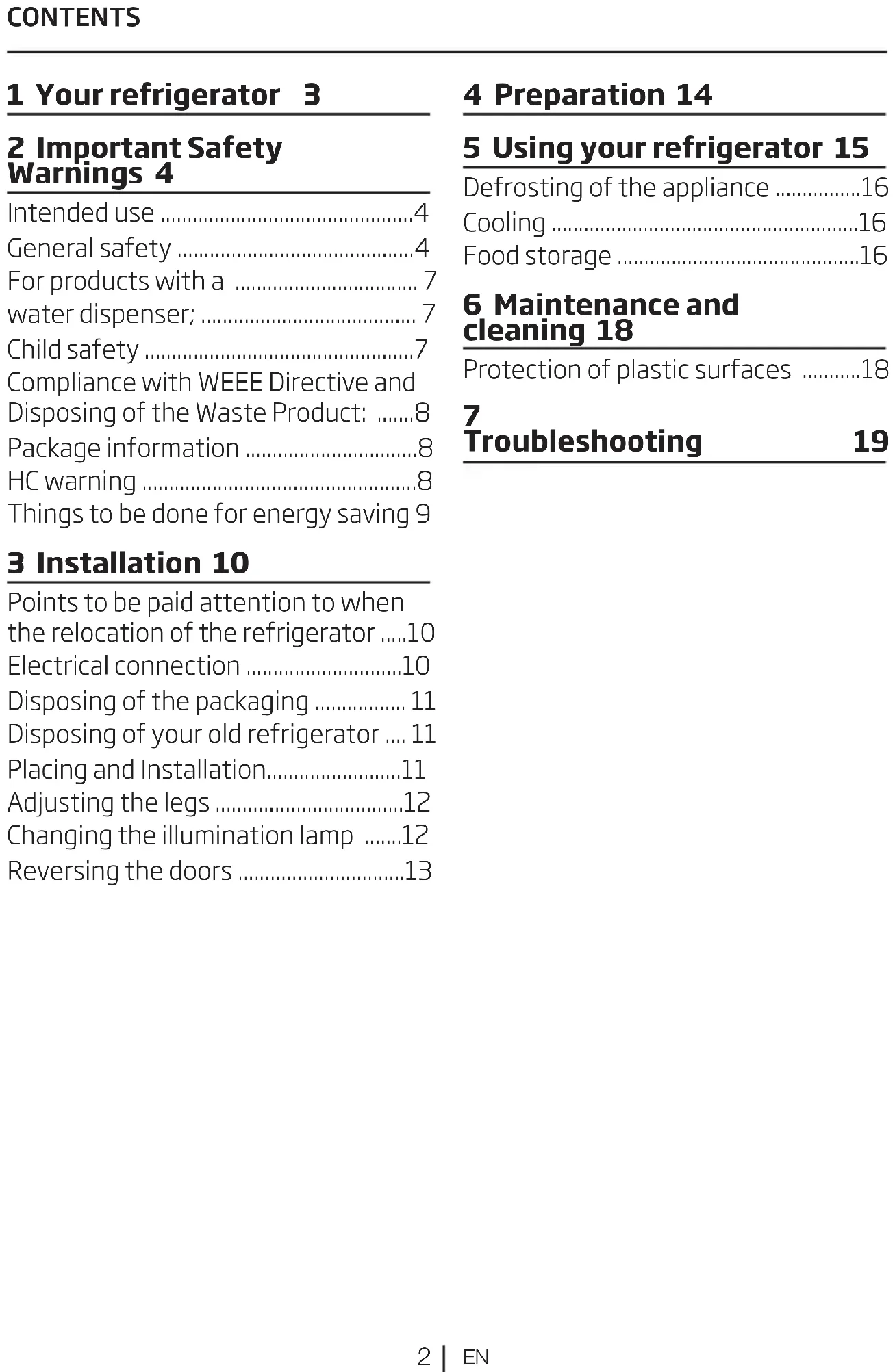 Compliance with WEEE Directive and Disposing of the Waste Product: This product complies with EU WEEE Directive (2012/19/ EU). This product bears a classification symbol for waste electrical and electronic equipment (WEEE). This product has been manufactured with high quality parts and materials which can be reused and are suitable for recycling. Therefore, do not dispose the product with normal domestic waste at the end of its service life. Take it to a collection point for the recycling of electrical and electronic equipment. Please consult your local authorities to learn the nearest collection point. Help protect the environment and natural resources by recycling used products. For children’s safety, cut the power cable and break the locking mechanism of the door, if any, so that it will be non-functional before disposing of the product. Package information Packaging materials of the product are manufactured from recyclable materials in accordance with our National Environment Regulations. Do not dispose of the packaging materials together with the domestic or other wastes. Take them to the packaging material collection points designated by the local authorities. Do not forget... Any recycled substance is an indispensable matter for nature and our national asset wealth. If you want to contribute to the re-evaluation of the packaging materials, you can consult to your environmentalist organizations or the municipalities where you are located. HC warning If your product's cooling system contains R600a: This gas is flammable. Therefore, pay attention to not damaging the cooling system and piping during usage and transportation. In the event of damage, keep your product away from potential fire sources that can cause the product catch a fire and ventilate the room in which the unit is placed. Ignore this warning if your product's cooling system contains R134a. Type of gas used in the product is stated in the type label which is on the left wall inside the refrigerator. Never throw the product in fire for disposal.EN