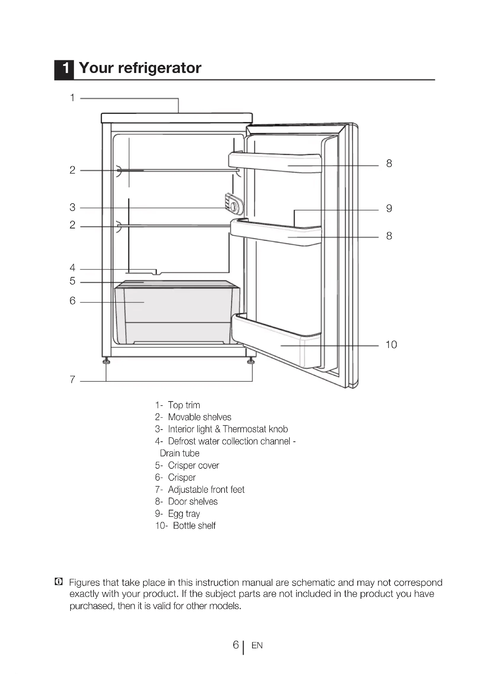 (Or) Min. Max. 1 = Lowest cooling setting (Warmest setting) 5 = Highest cooling setting (Coldest setting) (Or) Min. = Lowest cooling setting (Warmest setting) Max. = Highest cooling setting (Coldest setting) The average temperature inside the fridge should be around +5°C. Please choose the setting according to the desired temperature. Please note that there will be different temperatures in the cooling area. The coldest region is immediately above the vegetable compartment. The interior temperature also depends on ambient temperature, the frequency with which the door is opened and the amount of foods kept inside. Frequently opening the door causes the interior temperature to rise. For this reason, it is recommended to close the door again as soon as possible after use. 5 Using your refrigerator Using interior compartments Movable shelves: Distance between the shelves can be adjusted when necessary. Vegetable drawer: Vegetables and fruits can be stored in this compartment for long periods without decaying. Bottle shelf: Bottles, jars and tins can be placed in these shelves. Cooling Food storage The refrigerator is for the short-term storage of fresh food and drinks. Store milk products in the intended compartment in the refrigerator. Bottles can be stored in the bottle holder or in the bottle shelf of the door. Raw meat is best kept in a polyethylene bag in the compartment at the very bottom of the refrigerator. Allow hot foods and beverages to cool to room temperature prior to placing them in the refrigerator.