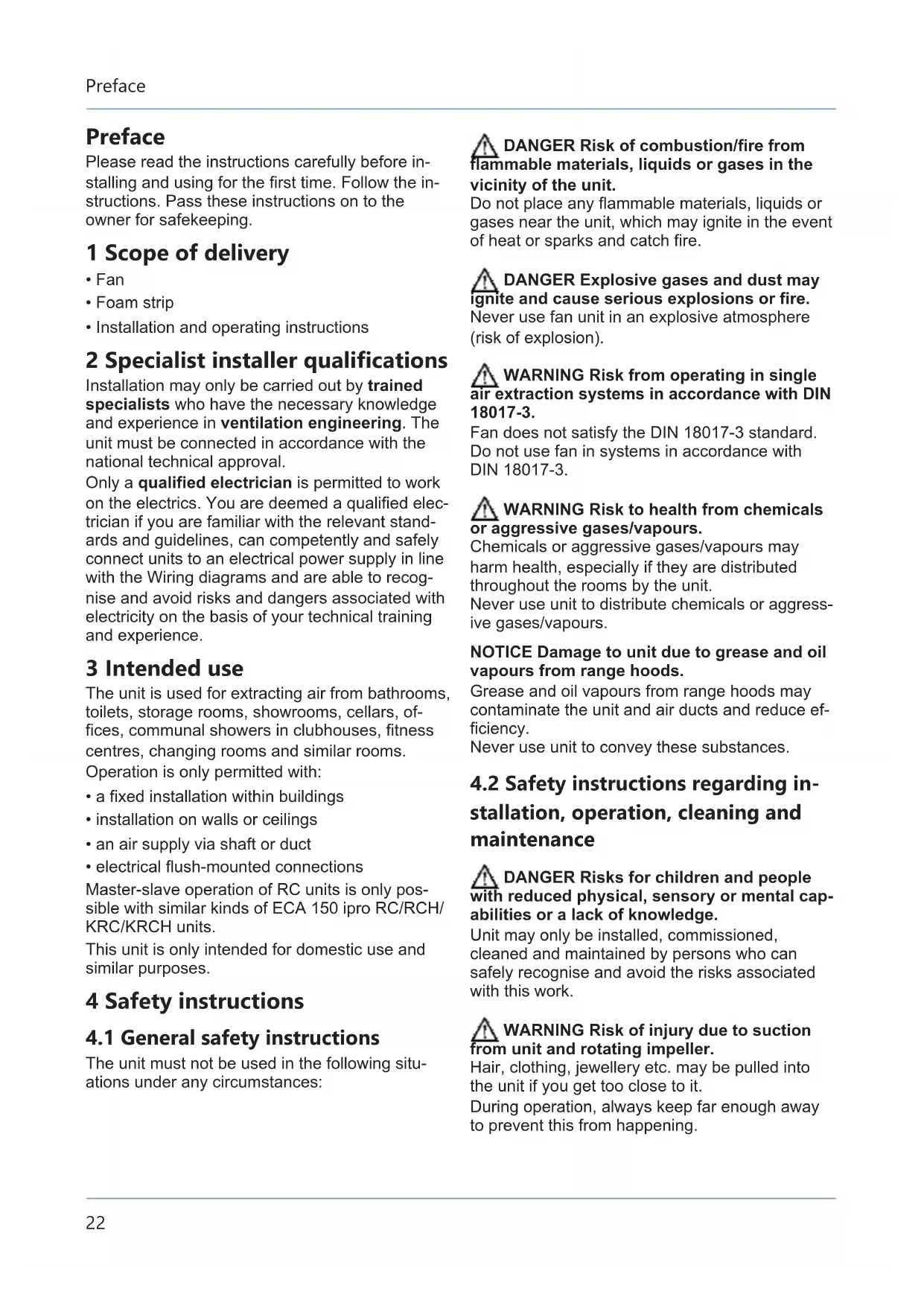 The unit must not be used in the following situ- ations under any circumstances: DANGER Risk of combustion/fire from flammable materials, liquids or gases in the vicinity of the unit. Do not place any flammable materials, liquids or gases near the unit, which may ignite in the event of heat or sparks and catch fire. DANGER Explosive gases and dust may ignite and cause serious explosions or fire. Never use fan unit in an explosive atmosphere (risk of explosion). WARNING Risk from operating in single air extraction systems in accordance with DIN 18017-3. Fan does not satisfy the DIN 18017-3 standard. Do not use fan in systems in accordance with DIN 18017-3. WARNING Risk to health from chemicals or aggressive gases/vapours. Chemicals or aggressive gases/vapours may harm health, especially if they are distributed throughout the rooms by the unit. Never use unit to distribute chemicals or aggress- ive gases/vapours. NOTICE Damage to unit due to grease and oil vapours from range hoods. Grease and oil vapours from range hoods may contaminate the unit and air ducts and reduce ef- ficiency. Never use unit to convey these substances.