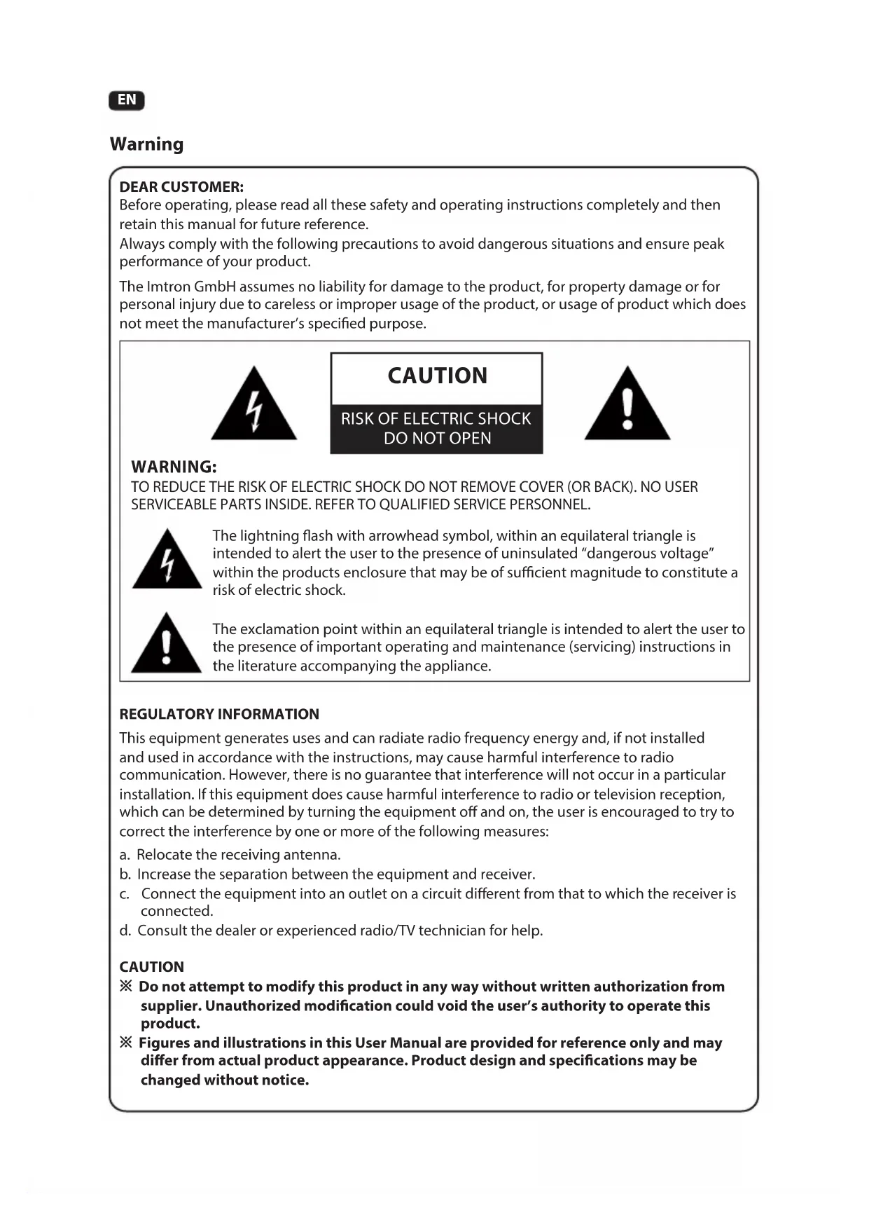DEAR CUSTOMER: Before operating, please read all these safety and operating instructions completely and then retain this manual for future reference. Always comply with the following precautions to avoid dangerous situations and ensure peak performance of your product. The Imtron GmbH assumes no liability for damage to the product, for property damage or for personal injury due to careless or improper usage of the product, or usage of product which does not meet the manufacturer’s specied purpose. Warning
