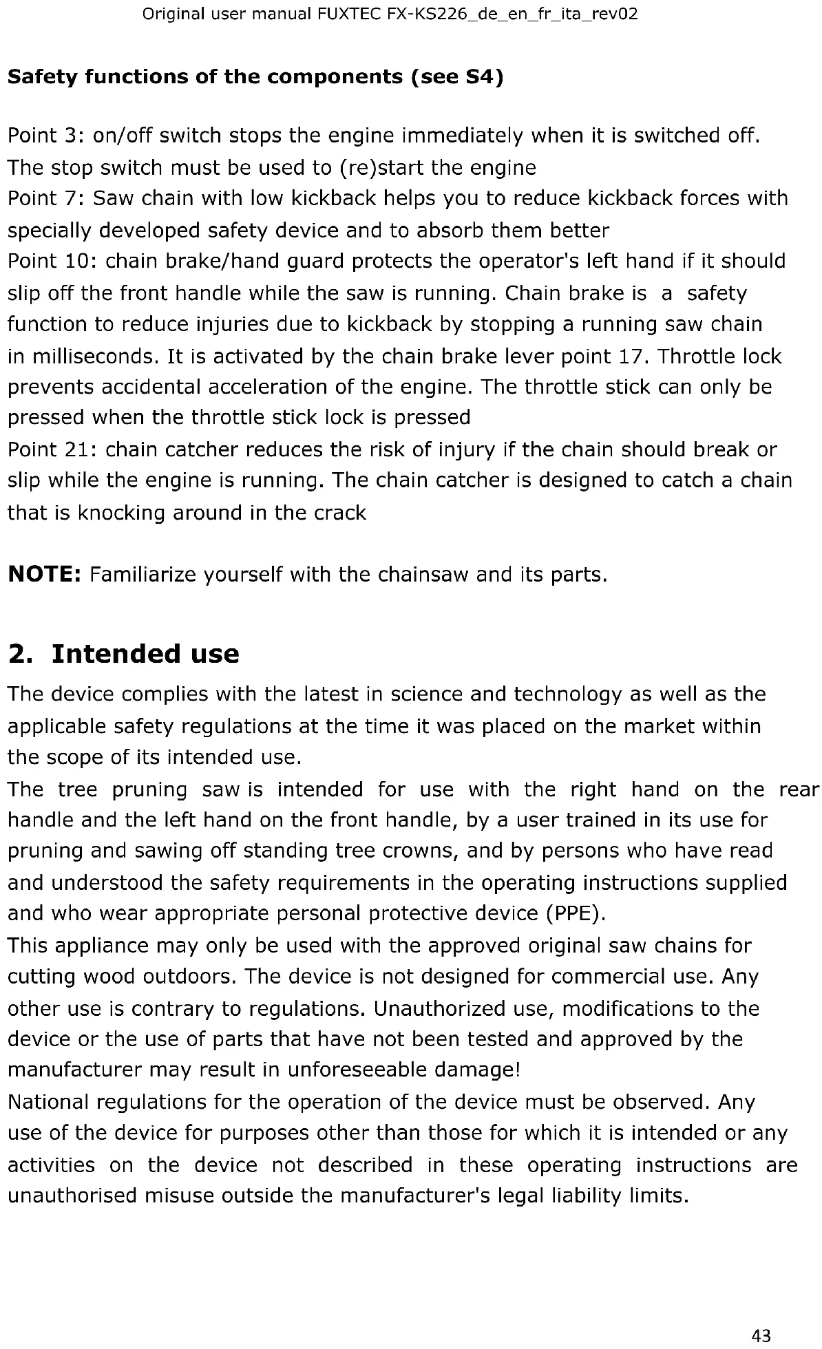 The device complies with the latest in science and technology as well as the applicable safety regulations at the time it was placed on the market within the scope of its intended use. The tree pruning saw is intended for use with the right hand on the rear handle and the left hand on the front handle, by a user trained in its use for pruning and sawing off standing tree crowns, and by persons who have read and understood the safety requirements in the operating instructions supplied and who wear appropriate personal protective device (PPE). This appliance may only be used with the approved original saw chains for cutting wood outdoors. The device is not designed for commercial use. Any other use is contrary to regulations. Unauthorized use, modifications to the device or the use of parts that have not been tested and approved by the manufacturer may result in unforeseeable damage! National regulations for the operation of the device must be observed. Any use of the device for purposes other than those for which it is intended or any activities on the device not described in these operating instructions are unauthorised misuse outside the manufacturer's legal liability limits.MODE D´EMPLOI ORIGINAL FUXTEC FX-KS226_de_en_fr_ita_rev02