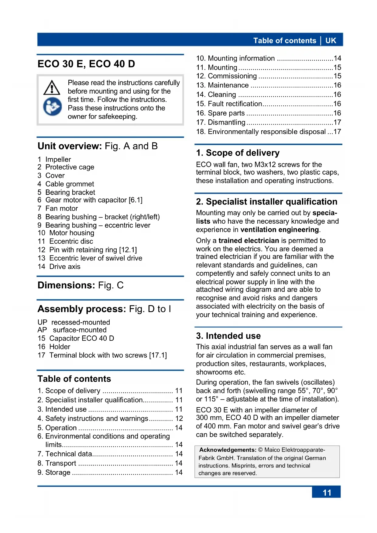 This axial industrial fan serves as a wall fan for air circulation in commercial premises, production sites, restaurants, workplaces, showrooms etc. During operation, the fan swivels (oscillates) back and forth (swivelling range 55°, 70°, 90° or 115° – adjustable at the time of installation). ECO 30 E with an impeller diameter of 300 mm, ECO 40 D with an impeller diameter of 400 mm. Fan motor and swivel gear’s drive can be switched separately. Acknowledgements: © Maico Elektroapparate- Fabrik GmbH. Translation of the original German instructions. Misprints, errors and technical changes are reserved.UK │ 3. Intended use