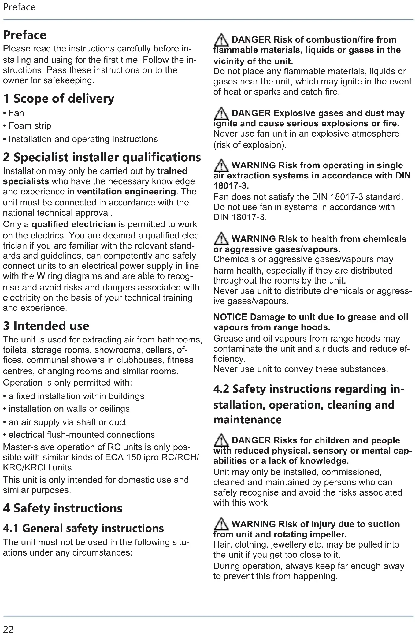 The unit must not be used in the following situ- ations under any circumstances: DANGER Risk of combustion/fire from flammable materials, liquids or gases in the vicinity of the unit. Do not place any flammable materials, liquids or gases near the unit, which may ignite in the event of heat or sparks and catch fire. DANGER Explosive gases and dust may ignite and cause serious explosions or fire. Never use fan unit in an explosive atmosphere (risk of explosion). WARNING Risk from operating in single air extraction systems in accordance with DIN 18017-3. Fan does not satisfy the DIN 18017-3 standard. Do not use fan in systems in accordance with DIN 18017-3. WARNING Risk to health from chemicals or aggressive gases/vapours. Chemicals or aggressive gases/vapours may harm health, especially if they are distributed throughout the rooms by the unit. Never use unit to distribute chemicals or aggress- ive gases/vapours. NOTICE Damage to unit due to grease and oil vapours from range hoods. Grease and oil vapours from range hoods may contaminate the unit and air ducts and reduce ef- ficiency. Never use unit to convey these substances.