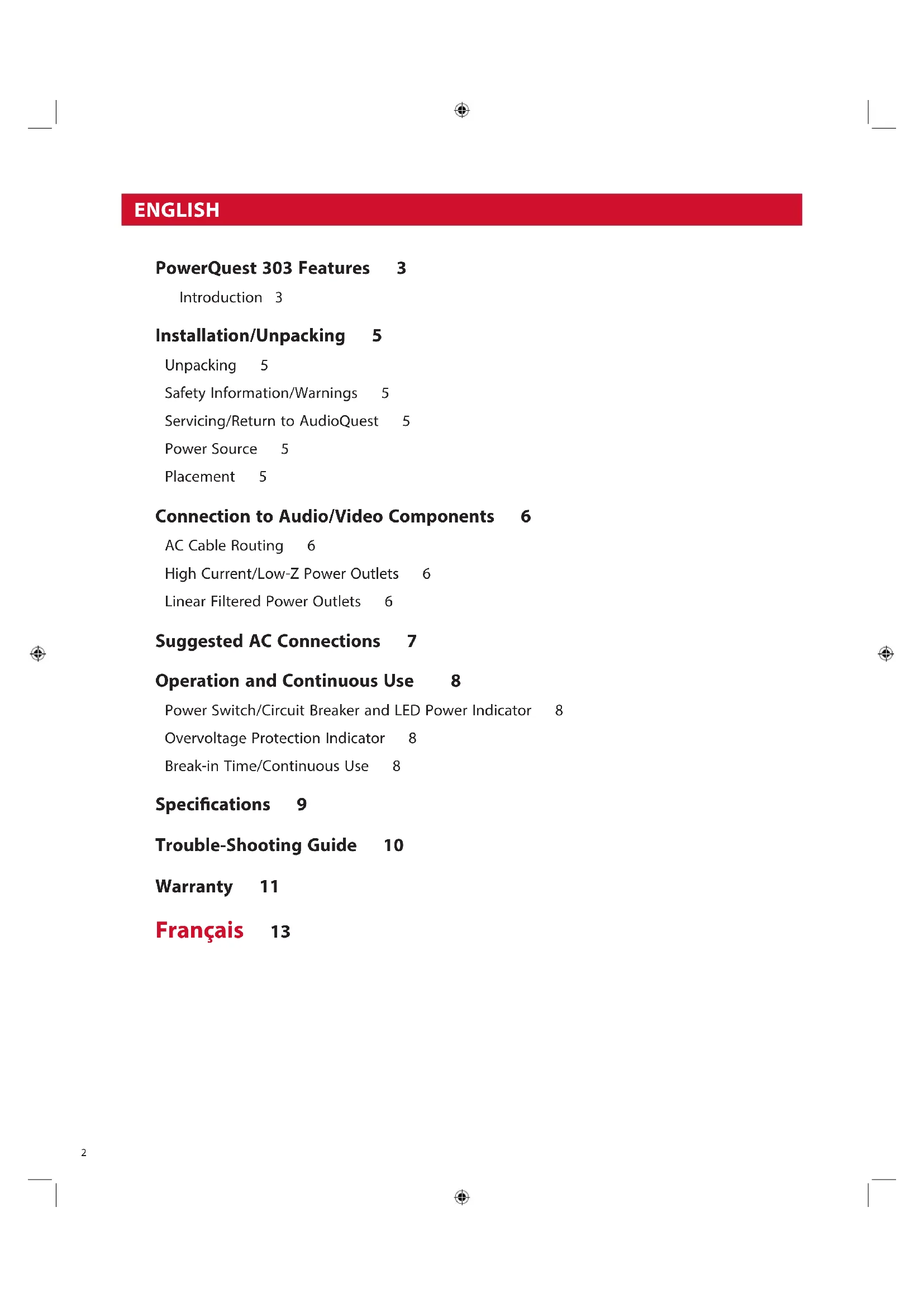PowerQuest 303 Features 3 Introduction 3 Installation/Unpacking 5 Unpacking 5 Safety Information/Warnings 5 Servicing/Return to AudioQuest 5 Power Source 5 Placement 5 Connection to Audio/Video Components 6 AC Cable Routing 6 High Current/Low-Z Power Outlets 6 Linear Filtered Power Outlets 6 Suggested AC Connections 7 Operation and Continuous Use 8 Power Switch/Circuit Breaker and LED Power Indicator 8 Overvoltage Protection Indicator 8 Break-in Time/Continuous Use 8 Specications 9 Trouble-Shooting Guide 10 Warranty 11 Français 13 ENGLISH3 PowerQuest 303 Features ¡ Linear Dierential Filter: 30kHz – 1GHz (well in excess of 22dB) ¡ Filters linearized for (rising) line impedance with frequency from 0.05 Ohms (source) and 10 to 50 Ohms load (system current dependent) ¡ Non-Sacricial Surge Suppression (will withstand multiple strikes of 6000V or 3000A without damage) ¡ Extreme Voltage Shutdown: 140VAC. Will activate main circuit relay in under 0.25 seconds. Automatically resets once incoming voltage is within a safe range ¡ (4) High-Current outlets; (8) Linear Filtered Source outlets ¡ Detachable 2-meter PowerQuest PQ-415 AC Cord ¡ Maximum Input Current Capacity: 15A RMS ¡ 2RU rack mountable metal chassis (rack ears included) Introduction The science of AC power is not simple; it demands focus, and the devil is in the details. In fact, the mammoth increase in airborne and AC-line-transmitted radio signals, combined with overtaxed utility lines and the ever-increasing demands from high-denition audio/video components, has rendered our utilities’ AC power an antiquated technology. Where Alternating Current (AC) is concerned, we’re relying on a century-old technology created for incandescent lights and electric motors—technology that was certainly never meant to power the sophisticated analog and digital circuits used in premium audio/video systems. To properly accommodate the promise of today’s ever-increasing bandwidth and dynamic range, we must achieve extraordinarily low noise across a wide range of frequencies. Further, today’s power ampliers are being taxed for instantaneous peak-current demand, even when they’re driven at modest volumes. Although we have seen a substantial increase in both dynamics and bass content from our audio software, the loudspeakers we employ to reproduce them are no more ecient than they were two to four decades ago. This places great demands on an amplier’s power supply, as well as the source AC power supplying it. Our systems’ sensitive components need better alternating current—a fact that has resulted in a host of AC power conditioning, isolation transformers, regeneration ampliers, and battery back-up system topologies. Through dierential sample tests and spectrum analysis, it can be proven that up to a third of a high- resolution (low-level) audio signal can be lost, masked, or highly distorted by the vast levels of noise riding along the AC power lines that feed our components. This noise couples into the signal circuitry as current noise and through AC ground, permanently distorting and/or masking the source signal. All sincere attempts to solve this problem must be applauded since once the audio/video signal is gone, it’s gone forever... For AudioQuest, honoring the source is never a matter of simply using premium “audiophile-grade parts” or relying on a proprietary technology—common approaches used within the audiophile market. For years, we have all been witness to the same, seemingly endless audiophile debates: Valves versus transistors. Analog versus digital. Can cables really make a dierence? The debates go on and on. While we, too, can brag about our many unique technologies, we realize that true audio/video optimization is never a matter of any one secret or exotic circuit. When it comes to noise dissipation for AC power, many approaches can yield meaningful results. However, they may also impart ringing, current compression, and non-linear distortions that are worse than the disease.4 Though it’s easy to boast, it’s quite another thing to create a solution that is consistent, holistic, functional, and that honors veriable science. It’s not enough to reduce AC line noise and its associated distortions at just one octave, thus leaving vulnerable the adjacent octaves and octave partials to noise, resonant peaking, or insucient noise reduction. Consistency is key. We should never accept superior resolution in one octave, only to suer from masking eects a half-octave away and ringing artifacts two octaves from there. This is the principal criterion for all AudioQuest’s AC power products. The PowerQuest 303 represents over 25 years of exhaustive research and proven AC power products designed for audiophiles, broadcast engineers, and professional audio applications. We welcome you to experience the PowerQuest 303 and hear rsthand the remarkable results of highly optimized power management. —Garth Powell, Senior Director of Engineering, AudioQuest5 Installation | Unpacking Before unpacking your PowerQuest 303, inspect the carton for any obvious damage to the boxes and internal protective materials. If internal damage is likely, contact the carrier who delivered the unit. If shipping damage is evident on the product, then please contact your shipping carrier. Please save all shipping and packing materials. Should you move or otherwise need to transport your PowerQuest 303, these packing materials will ensure the safest transportation. The carton should contain the PowerQuest 303 (120V North American NEMA Edison AC Outlets), two foam inserts, owner’s manual, rack-mount kit, and a 2m PowerQuest PQ-415 AC power cord. Registration is recommended. In the event that your original ownership documents are lost, your registration can be used to establish whether the unit is within the warranty period. Safety Information | Warnings Before operating the PowerQuest 303, please read and observe all safety and operating i