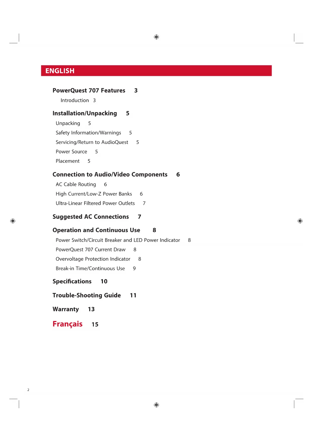 PowerQuest 707 Features 3 Introduction 3 Installation/Unpacking 5 Unpacking 5 Safety Information/Warnings 5 Servicing/Return to AudioQuest 5 Power Source 5 Placement 5 Connection to Audio/Video Components 6 AC Cable Routing 6 High Current/Low-Z Power Banks 6 Ultra-Linear Filtered Power Outlets 7 Suggested AC Connections 7 Operation and Continuous Use 8 Power Switch/Circuit Breaker and LED Power Indicator 8 PowerQuest 707 Current Draw 8 Overvoltage Protection Indicator 8 Break-in Time/Continuous Use 9 Specications 10 Trouble-Shooting Guide 11 Warranty 13 Français 15 ENGLISH3 PowerQuest 707 Features ¡ 45 Amps peak Transient Power Correction (up to 25 mS) ¡ Ultra-Linear Dierential Filter: 8kHz – 1GHz (well in excess of 22dB) ¡ Ultra-Linear Common-Mode Filter: 30kHz – 100MHz (well in excess of 22dB) ¡ Both lters linearized for (rising) line impedance with frequency from 0.05 Ohms (source) and 10 to 50 Ohms load (system current dependent) ¡ Non-Sacricial Surge Suppression (will withstand multiple strikes of 6000V or 3000A without damage) ¡ Extreme Voltage Shutdown: 140VAC. Will activate main circuit relay in under 0.25 seconds. Automatically resets once incoming voltage is within a safe range ¡ (4) High-Current spec-grade outlets; (8) Ultra-Linear Filtered Source outlets ¡ Detachable 2-meter PowerQuest PQ-715 AC cord featuring ZERO-Tech and RF/ND-Tech ¡ Ultra-low impedance magnetic circuit breaker/power switch ¡ Maximum Input Current Capacity: 15A RMS ¡ 2RU rack mountable metal chassis (rack ears included) Introduction The science of AC power is not simple; it demands focus, and the devil is in the details. In fact, the mammoth increase in airborne and AC-line-transmitted radio signals, combined with overtaxed utility lines and the ever-increasing demands from high-denition audio/video components, has rendered our utilities’ AC power an antiquated technology. Where Alternating Current (AC) is concerned, we’re relying on a century-old technology created for incandescent lights and electric motors—technology that was certainly never meant to power the sophisticated analog and digital circuits used in premium audio/video systems. To properly accommodate the promise of today’s ever-increasing bandwidth and dynamic range, we must achieve extraordinarily low noise across a wide range of frequencies. Further, today’s power ampliers are being taxed for instantaneous peak-current demand, even when they’re driven at modest volumes. Although we have seen a substantial increase in both dynamics and bass content from our audio software, the loudspeakers we employ to reproduce them are no more ecient than they were two to four decades ago. This places great demands on an amplier’s power supply, as well as the source AC power supplying it. Our systems’ sensitive components need better alternating current—a fact that has resulted in a host of AC power conditioning, isolation transformers, regeneration ampliers, and battery back-up system topologies. Through dierential sample tests and spectrum analysis, it can be proven that up to a third of a high- resolution (low-level) audio signal can be lost, masked, or highly distorted by the vast levels of noise riding along the AC power lines that feed our components. This noise couples into the signal circuitry as current noise and through AC ground, permanently distorting and/or masking the source signal. All sincere attempts to solve this problem must be applauded since once the audio/video signal is gone, it’s gone forever... For AudioQuest, honoring the source is never a matter of simply using premium “audiophile-grade parts” or relying on a proprietary technology—common approaches used within the audiophile market. For years, we have all been witness to the same, seemingly endless audiophile debates: Valves versus transistors. Analog versus digital. Can cables really make a dierence? The debates go on and on. While we, too, can brag4 about our many unique technologies, we realize that true audio/video optimization is never a matter of any one secret or exotic circuit. When it comes to noise dissipation for AC power, many approaches can yield meaningful results. However, they may also impart ringing, current compression, and non-linear distortions that are worse than the disease. The PowerQuest 707 uses the widest bandwidth-linearized noise-dissipation circuit in its class. Our unique passive/active Transient Power Correction Circuit features an instantaneous current reservoir of over 45 amps peak, specically designed for modern current-starved power ampliers. Most AC power products featuring “high-current outlets” merely minimize current compression; the PowerQuest 707 works to correct it. Though it’s easy to boast, it’s quite another thing to create a solution that is consistent, holistic, functional, and that honors veriable science. It’s not enough to reduce AC line noise and its associated distortions at just one octave, thus leaving vulnerable the adjacent octaves and octave partials to noise, resonant peaking, or insucient noise reduction. Consistency is key. We should never accept superior resolution in one octave, only to suer from masking eects a half-octave away and ringing artifacts two octaves from there. This is the principal criterion for all AudioQuest’s AC power products. The PowerQuest 707 represents over 25 years of exhaustive research and proven AC power products designed for audiophiles, broadcast engineers, and professional audio applications. We welcome you to experience the PowerQuest 707 and hear rsthand the remarkable results of highly optimized power management. —Garth Powell, Senior Director of Engineering, AudioQuest5 Installation | Unpacking Before unpacking your PowerQuest 707, inspect the carton for any obvious damage to the boxes and internal protective materials. If internal damage is likely, contact the carrier who delivered the unit. If shipping damage is evident on the p
