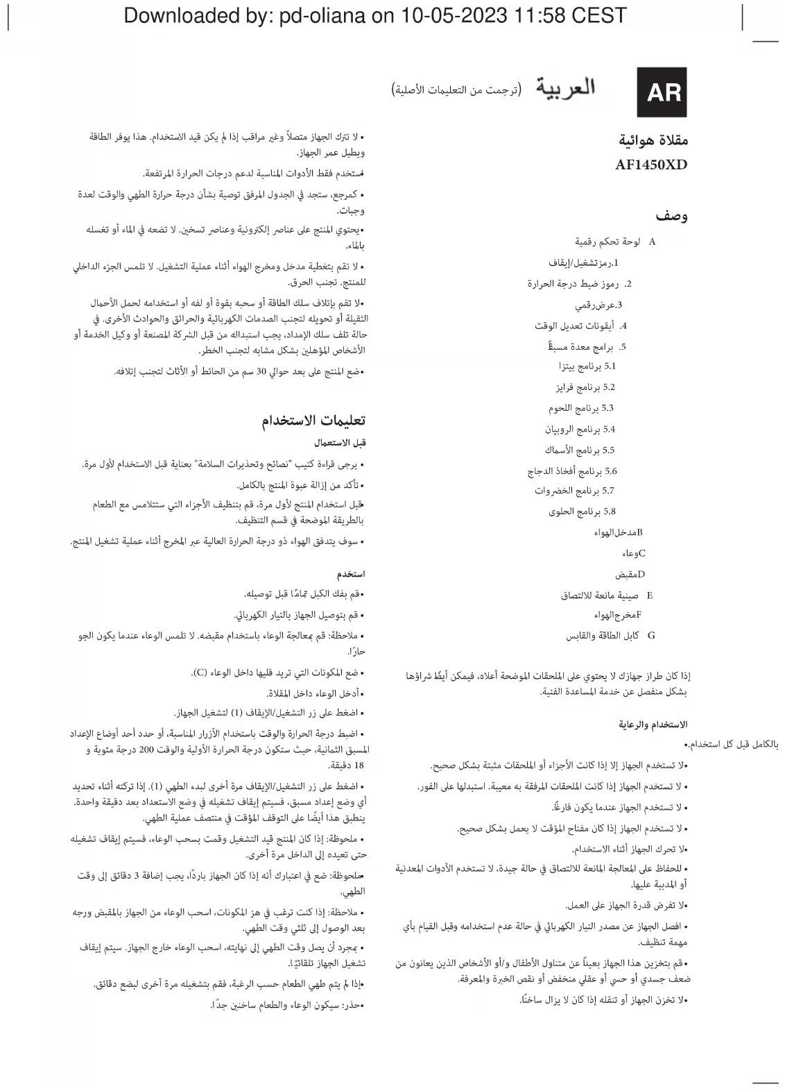 - Foods may vary in origin, size, shape and brand, so we cannot guarantee the best settings for any specic food. Downloaded by: pd-oliana on 10-05-2023 11:58 CESTCOOKING GUIDE Food Amount (g) (min-max) Time (min) Temp. (°C) Shake Extra information Potatoes & fries Thin frozen fries 300-1200 9-16 200 Yes Thick frozen fries 300-1200 11-20 200 Yes Home-made fries (5×8mm) 300-1200 16-10 200 Yes Add 1/2 tbsp oil Home-made potato wedges 300-1200 18-22 180 Yes Add 1/2 tbsp oil Home-made potato cubes 300-1200 12-18 180 Yes Add 1/2 tbsp oil Rosti 250 15-18 180 Yes Potato gratin 500 15-18 200 Yes Meat & Poultry Steak 100-500 8-12 180 Pork chops 100-500 10-14 180 Hamburger 100-500 7-14 180 Sausage roll 100-500 13-15 180 Drumsticks 100-500 18-22 180 Chicken breast 100-500 10-15 180 Snacks Spring rolls 100-400 8-10 200 Yes Frozen chicken nuggets 100-500 6-10 200 Yes Frozen sh ngers 100-400 6-10 200 Frozen breadcrumbed cheese snacks 100-400 8-10 180 Stuffed vegetables 100-400 10 160 Baking Cake 300 20-25 160 Use baking tin/ oven dish Quiche 400 20-22 180 Use baking tin Mufns 300 15-18 200 Use baking tin/ oven dish Sweet snacks 400 20 160 Downloaded by: pd-oliana on 10-05-2023 11:58 CESTTROUBLESHOOTING Problem Possible cause Solution The AIR FRYER does not work. The appliance is not plugged in. Put the mains plug in an earthed wall socket. You have not set the Timer. Press the according button to the required cooking time to switch on the appliance. The foods fried with the AIR FRYER are not done. The quantity of food in the pot is too much. Put smaller batches of food in the pot. Smaller batches are fried more evenly. The set temperature is too low. Press the temperature buttons until you reach the desired temperature. Temperature setting - refer to the cooking guide for reference. The food is fried unevenly in the AIR FRYER. Certain food types need to be shaken halfway through the cooking time. Food that lies on top of or across each other (e.g. fries) needs to be shaken halfway through the cooking time. Fried snacks are not crispy when they come out of the AIR FRYER. Incorrect food type used. Refer to food manufacturers cooking instructions. White smoke comes out from the appliance. Food with high oil content has been used. Oil has been added to the food. Do not use food groups with high oil content or add extra oil that is not required. An air fryer uses technology where low or no oil is required. The pot still contains grease residues from previous use. White smoke is caused by grease heating up in the pot. Make sure you clean the pot correctly after each use. Cannot slide the tray into the appliance. Pot overloaded. Do not ll the pot above the indication mentioned in the cooking guide. Downloaded by: pd-oliana on 10-05-2023 11:58 CESTFrançais (Traduit des instructions originales)