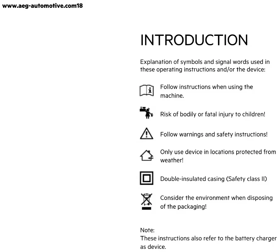 LED Error lights up if connected incorrectly. An alarm will also sound. 19 Handle for carrying the charger. Functions The charger is equipped with a microprocessor (MCU - Micro Computer Unit) and features fully automatic charging-, diagnostic-, emergency- and maintenance functions. After selecting the battery type connected (12 V or 24 V) the battery charger will recognise the battery capacity and the battery condition and calculate the required charging pa- rameters (charging voltage, charging current). This allows for eicient and safe charging. If the wrong battery voltage is set or the battery is defective, it will not charge and the “Error” LED (18) will light up (also see “Troubleshooting”). The “trickle charge” function allows the charger to be permanently connected. A full charge will be maintained.www.aeg-automotive.com24 OPERATION Before use Warning! Before using this device be sure to read the ope- rating manual for the battery and the vehicle and understand all safety notices.