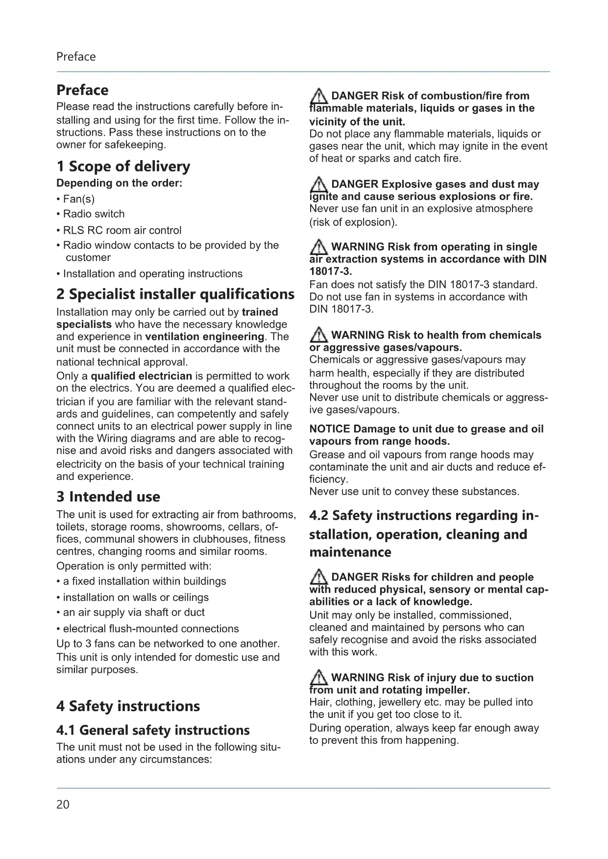 The unit must not be used in the following situ- ations under any circumstances: DANGER Risk of combustion/fire from flammable materials, liquids or gases in the vicinity of the unit. Do not place any flammable materials, liquids or gases near the unit, which may ignite in the event of heat or sparks and catch fire. DANGER Explosive gases and dust may ignite and cause serious explosions or fire. Never use fan unit in an explosive atmosphere (risk of explosion). WARNING Risk from operating in single air extraction systems in accordance with DIN 18017-3. Fan does not satisfy the DIN 18017-3 standard. Do not use fan in systems in accordance with DIN 18017-3. WARNING Risk to health from chemicals or aggressive gases/vapours. Chemicals or aggressive gases/vapours may harm health, especially if they are distributed throughout the rooms by the unit. Never use unit to distribute chemicals or aggress- ive gases/vapours. NOTICE Damage to unit due to grease and oil vapours from range hoods. Grease and oil vapours from range hoods may contaminate the unit and air ducts and reduce ef- ficiency. Never use unit to convey these substances.